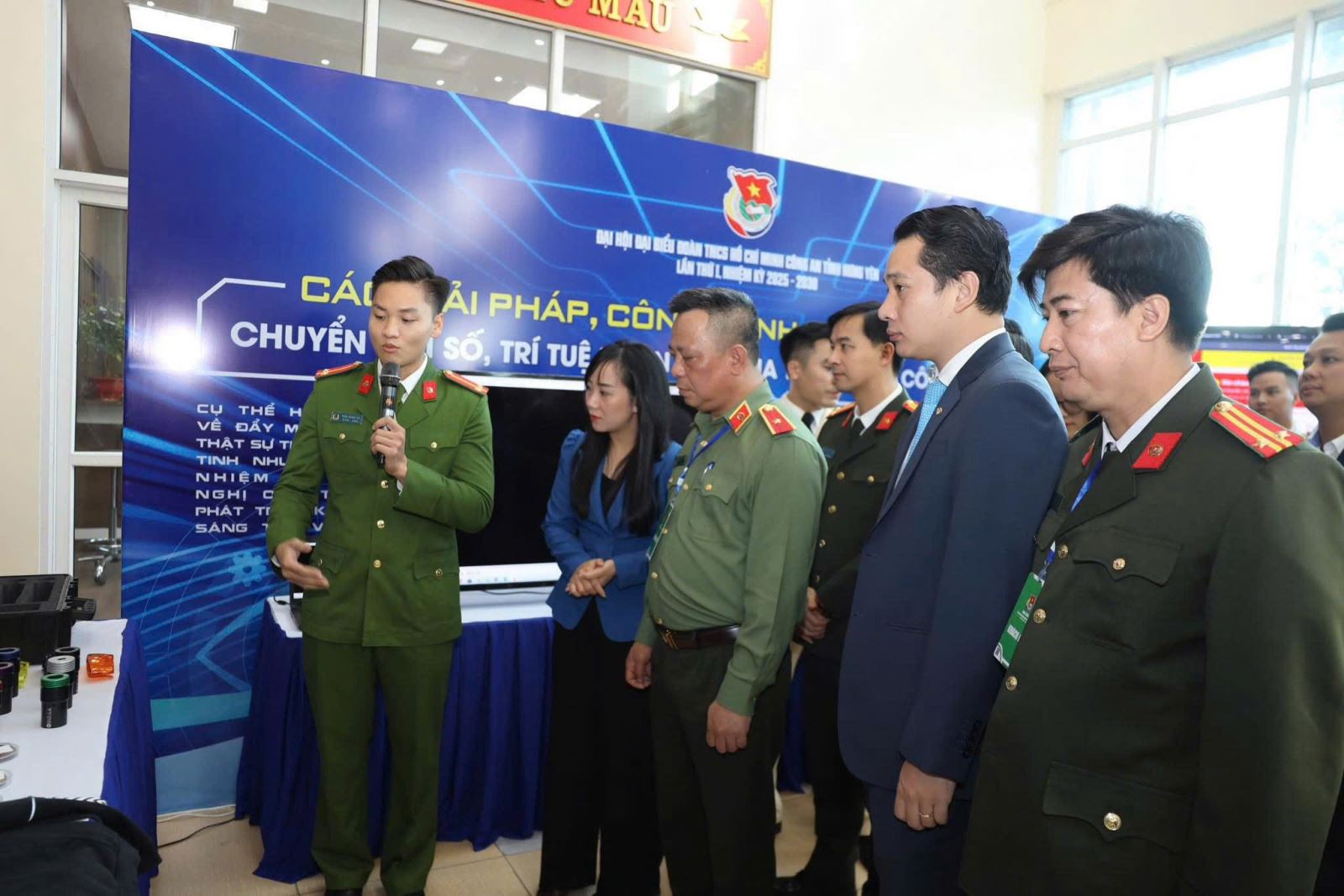 Cán bộ phòng Kỹ thuật hình sự trình bày mô hình “Tối ưu hóa điều kiện ánh sáng hỗ trợ phát hiện một số vi vết vải sợi, phục vụ công tác giám định, khám nghiệm hiện trường”