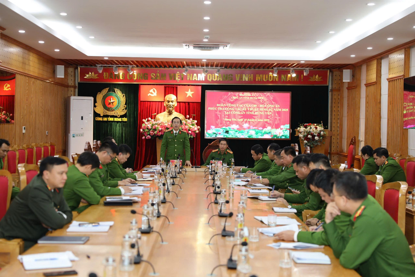 Ngày 18/11/2025, Đoàn phúc tra của Viện Khoa học hình sự - Bộ Công an do đồng chí Đại tá Đặng Văn Đoàn, Phó Viện trưởng làm Trưởng đoàn đã có buổi làm việc tại Công an tỉnh Hưng Yên nhằm phúc tra và đánh giá kết quả công tác Kỹ thuật hình sự năm 2025. Dự buổi làm việc có đồng chí Đại tá Cao Minh Tuấn, Phó Giám đốc Công an tỉnh, Thủ trưởng Cơ quan Cảnh sát điều tra, cùng các đồng chí lãnh đạo Phòng Kỹ thuật hình sự, đại diện lãnh đạo các đơn vị chức năng thuộc Công an tỉnh.