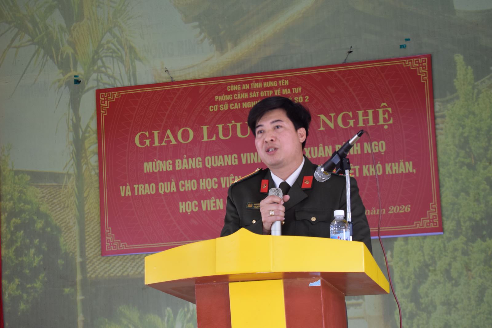Sáng 04/02/2026, trong chương trình giao lưu văn nghệ Mừng Đảng quang vinh, mừng xuân Bính Ngọ tại Cơ sở cai nghiện ma túy số 2 (xã Đông Quan, tỉnh Hưng Yên), đoàn công tác đã thăm hỏi, động viên, tặng quà 15 học viên có hoàn cảnh khó khăn đang cai nghiện tại cơ sở. Với tinh thần tương thân, tương ái, dùng tình thương để cảm hoá giáo dục người lầm lỗi, động viên họ cố gắng phấn đấu chấp hành nội quy, tích cực học tập hướng nghiệp dạy nghề để sớm tái hòa nhập cộng đồng. Dự, động viên chương trình có đồng chí Trung tá Nguyễn Lê Hanh - Phó Trưởng phòng Công tác chính trị, đồng chí Thượng tá Đỗ Việt Hải - Phó Trưởng phòng Cảnh sát điều tra tội phạm về ma tuý, Công an tỉnh.