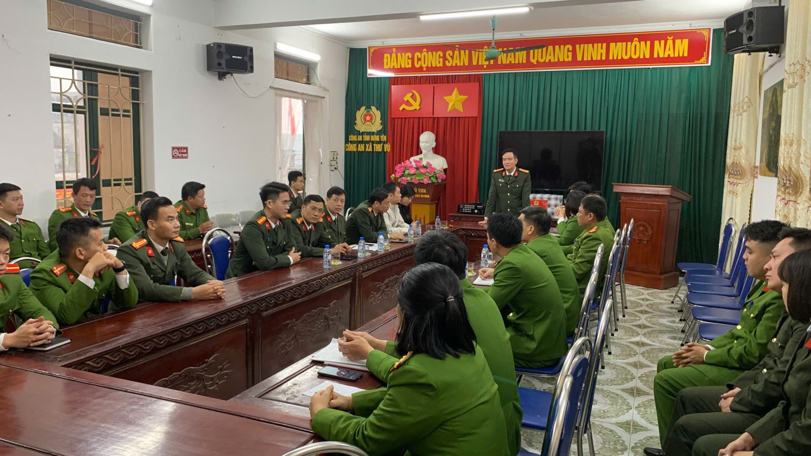 Báo cáo với Đoàn công tác phương án đảm bảo an ninh trật tự đêm giao thừa Tết nguyên đán Bính Ngọ 2026 và công tác đảm bảo an ninh, an toàn bầu cử đại biểu Quốc hội và HĐND các cấp, các sự kiện chính trị quan trọng và Lễ hội đầu năm 2026, thay mặt Đảng uỷ, chính quyền xã Thư Vũ, đồng chí Bí thư Đảng uỷ xã bày tỏ sự cảm ơn sâu sắc đối với sự quan tâm của Đảng uỷ, Ban Giám đốc Công an tỉnh đối với xã Thư Vũ, đồng thời đề cao vai trò, trách nhiệm của Công an xã trong đảm bảo ổn định về an ninh chính trị, giữ gìn trật tự an toàn xã hội trên địa bàn xã trong thời gian qua.