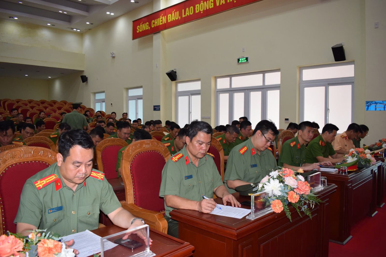 Các đồng chí lãnh đạo và cán bộ, chiến sĩ tham gia kiểm tra nội dung lý thuyết