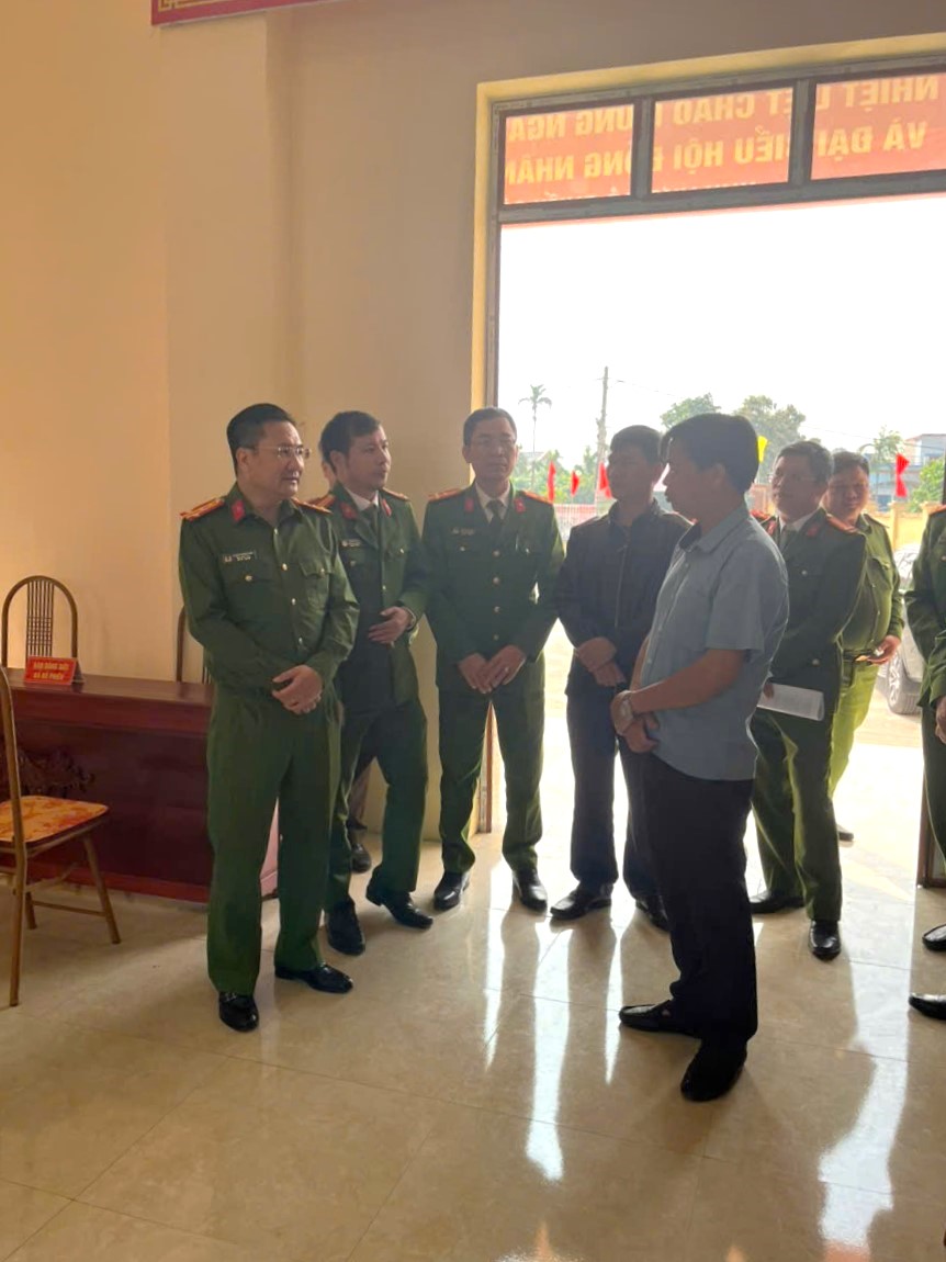 Đại tá Phạm Thanh Tiến – Phó Giám đốc Công an tỉnh cùng đoàn công tác làm việc cùng đại diện UBND xã và Công an xã