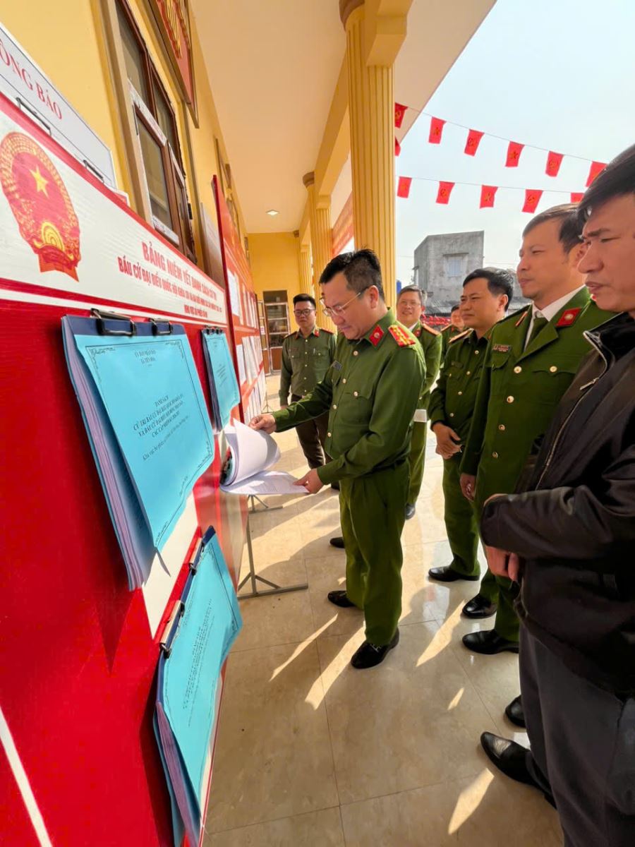 Đại tá Phạm Thanh Tiến – Phó Giám đốc Công an tỉnh kiểm tra một số điểm bầu cử trên địa bàn xã Tiên Hoa