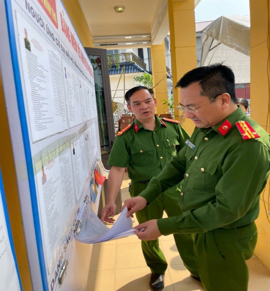 Sau khi nghe báo cáo, đồng chí Đại tá Phạm Thanh Tiến cùng đoàn công tác đã trực tiếp đi khảo sát, kiểm tra thực tế công tác chuẩn bị tại Nhà văn hóa thôn Bến Hiệp, đây là điểm bầu cử có số lượng cử tri đông nhất trên địa bàn xã với 1.174 cử tri tham gia bỏ phiếu. Tổ công tác đã kiểm tra việc bố trí khu vực bỏ phiếu, hệ thống cơ sở vật chất, công tác phòng cháy chữa cháy, phương án phân công lực lượng đảm bảo an ninh trật tự cũng như công tác tuyên truyền, hướng dẫn cử tri tham gia bầu cử.