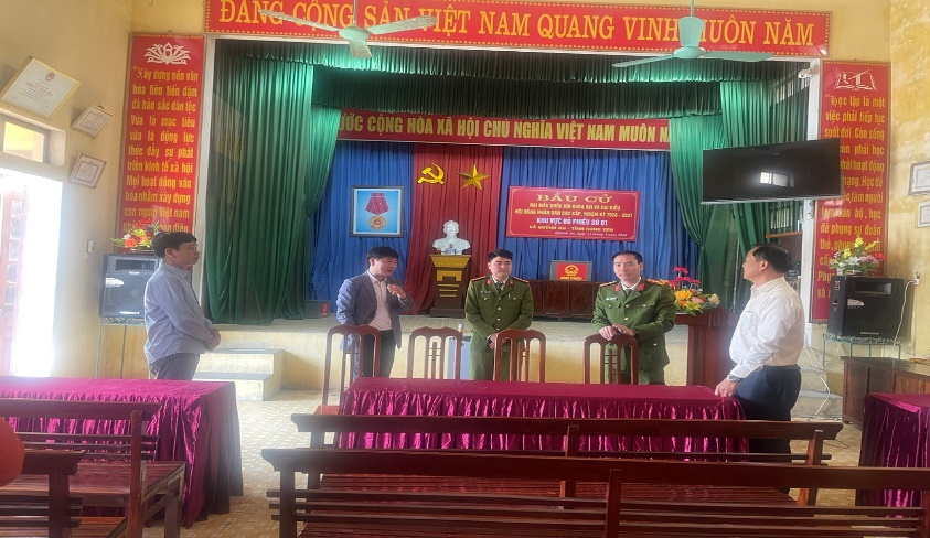 Đồng chí Đại tá Vũ Thành Trung – Phó Giám đốc Công an tỉnh kiểm tra công tác chuẩn bị bầu cử tại xã Quỳnh An
