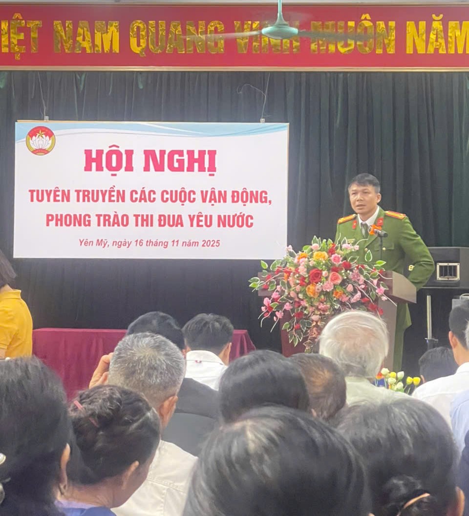 Phát biểu tại Ngày hội, đồng chí Trung tá Nguyễn Văn Phúc – Phó Trưởng Công an xã Yên Mỹ khẳng định: Ngày hội Đại đoàn kết không chỉ gắn kết cộng đồng mà còn phát huy mạnh mẽ vai trò của nhân dân trong bảo vệ ANTT. Đồng chí ghi nhận sự phối hợp hiệu quả giữa chính quyền, Mặt trận Tổ quốc, các đoàn thể và đặc biệt là sự đồng thuận, ủng hộ của nhân dân đã giúp tình hình ANTT trên địa bàn luôn ổn định. Các mô hình tự quản như Camera an ninh, Tổ liên gia PCCC, Tổ hòa giải hay Dòng họ tự quản tiếp tục là giải pháp hữu hiệu, hỗ trợ lực lượng Công an trong phòng ngừa tội phạm. Đồng chí mong muốn nhân dân tiếp tục đồng hành, cung cấp thông tin, chấp hành tốt pháp luật; đồng thời khẳng định lực lượng Công an xã sẽ tiếp tục phát huy tinh thần trách nhiệm, gần dân – sát dân, phục vụ nhân dân với phương châm “Vì Nhân dân phục vụ”.