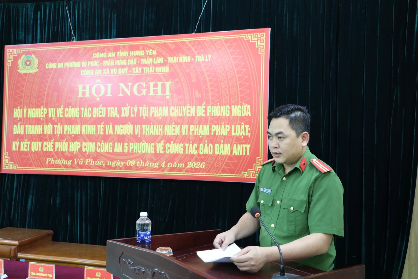 Đồng chí Trung tá Phan Thị Phương Thảo, Phó Trưởng Công an phường Vũ Phúc đã trình bày báo cáo tình hình, kết quả công tác điều tra, xử lý tội phạm kinh tế và người vị thành niên vi phạm pháp luật trên địa bàn 5 phường: Vũ Phúc, Trần Lãm, Trần Hưng Đạo, Thái Bình, Trà Lý. Báo cáo đã nêu rõ thực trạng vi phạm pháp luật về kinh tế, người vị thành niên vi phạm pháp luật trên địa bàn, một số kết quả mà Công an các phường, xã đã đạt được đồng thời cũng chỉ ra những hạn chế, tồn tại trong công tác đấu tranh, phòng chống tội phạm này.
