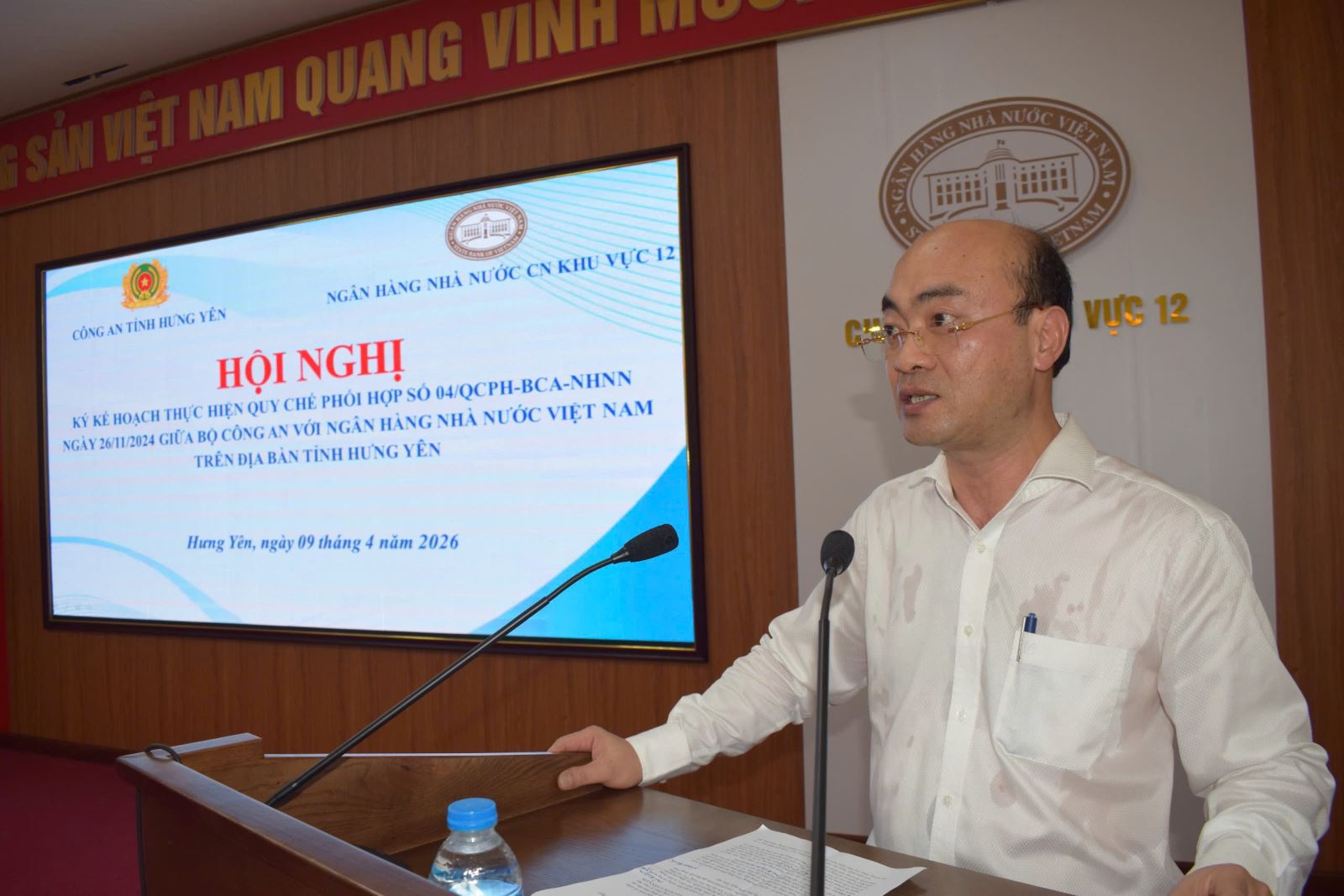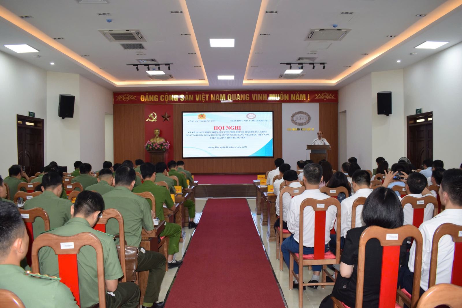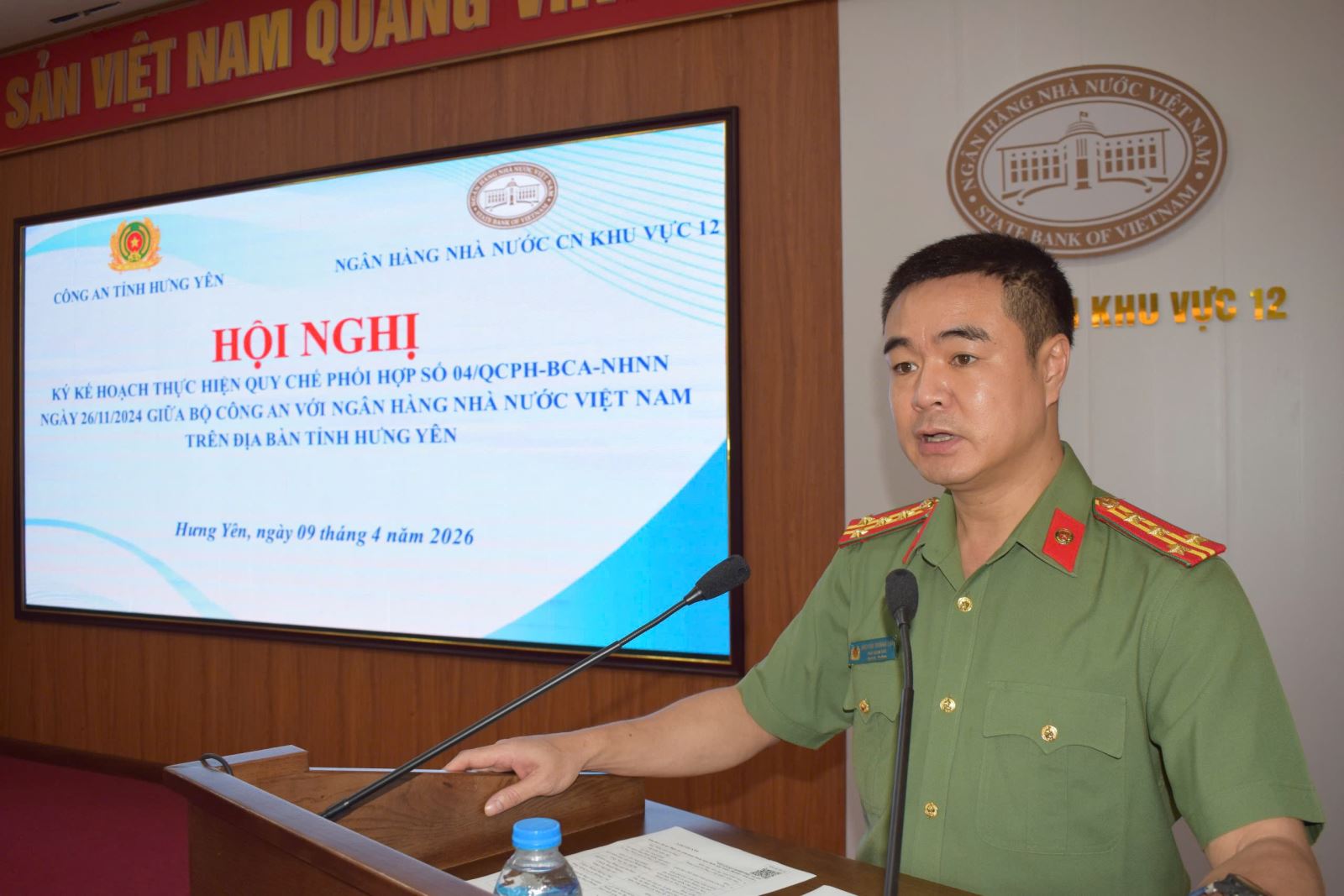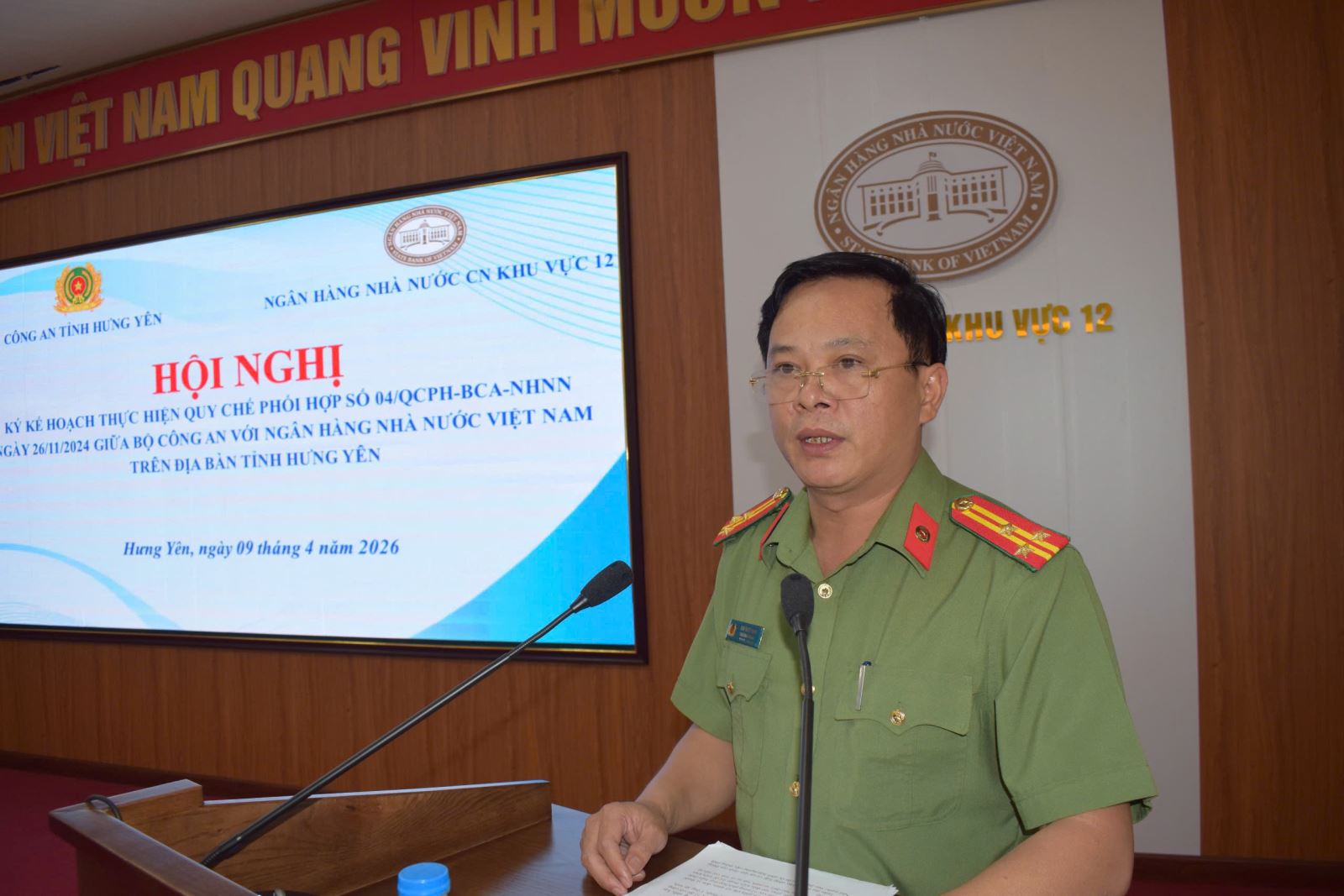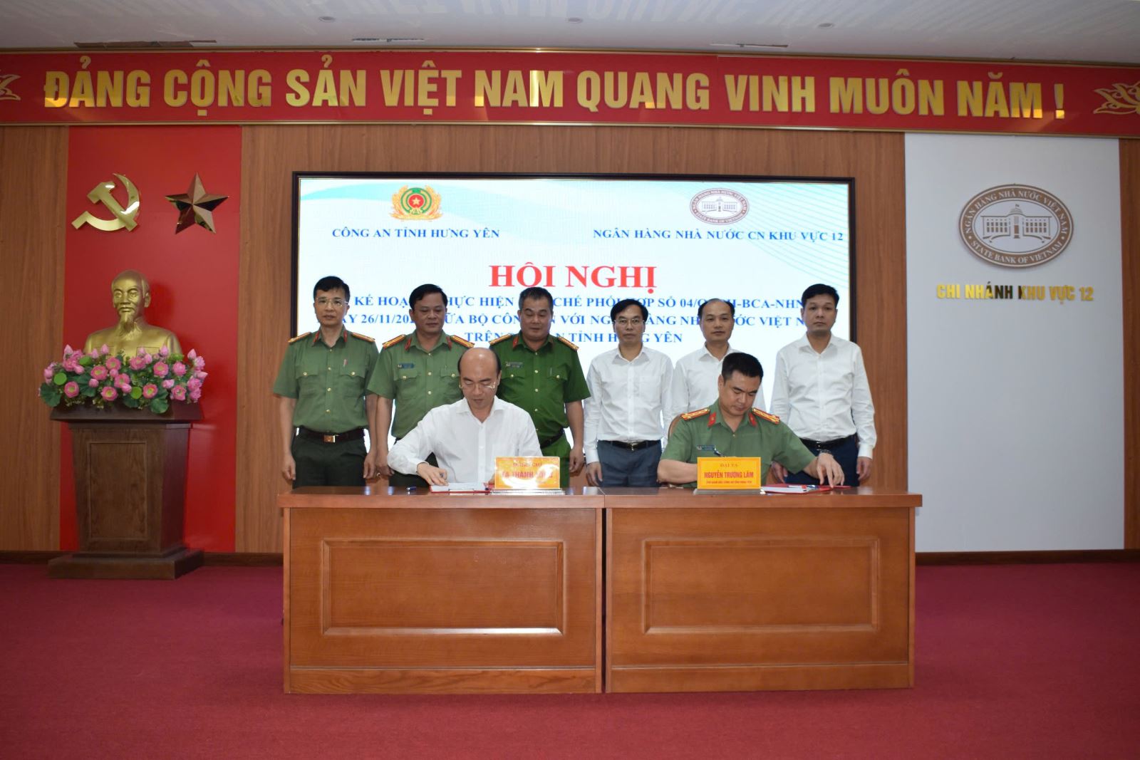 Thực hiện Quy chế phối hợp số 04/QCPH-BCA-NHNN ngày 26/11/2024, giữa Bộ Công an với Ngân hàng Nhà nước Việt Nam về đảm bảo an ninh, an toàn hệ thống tiền tệ, ngân hàng, ngày 09/4/2026, Công an tỉnh Hưng Yên phối hợp với Ngân hàng Nhà nước Khu vực 12 tổ chức Hội nghị ký kết Kế hoạch thực hiện Quy chế phối hợp trên địa bàn tỉnh. Đồng chủ trì Hội nghị có đồng chí Đại tá Nguyễn Trường Lâm, Phó Giám đốc Công an tỉnh và đồng chí Tạ Thanh Long, Giám đốc Ngân hàng Nhà nước Khu vực 12, cùng dự có đại diện lãnh đạo hai đơn vị và các phòng nghiệp vụ liên quan. Hội nghị được tổ chức nhằm cụ thể hóa các nội dung phối hợp giữa lực lượng Công an và ngành Ngân hàng trong công tác bảo đảm an ninh quốc gia, giữ gìn trật tự an toàn xã hội, đặc biệt trong lĩnh vực tiền tệ, hoạt động ngân hàng và phòng, chống tội phạm.