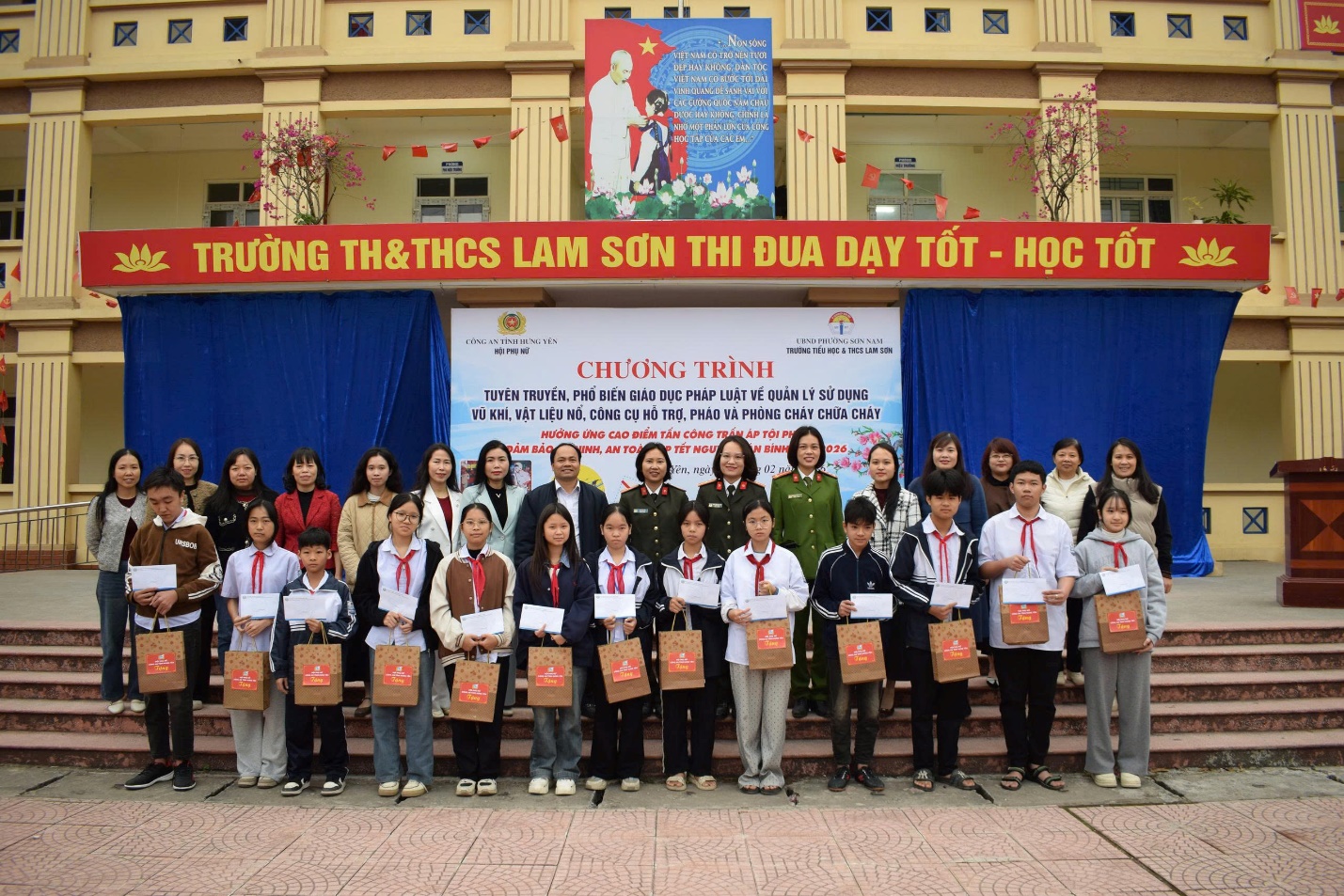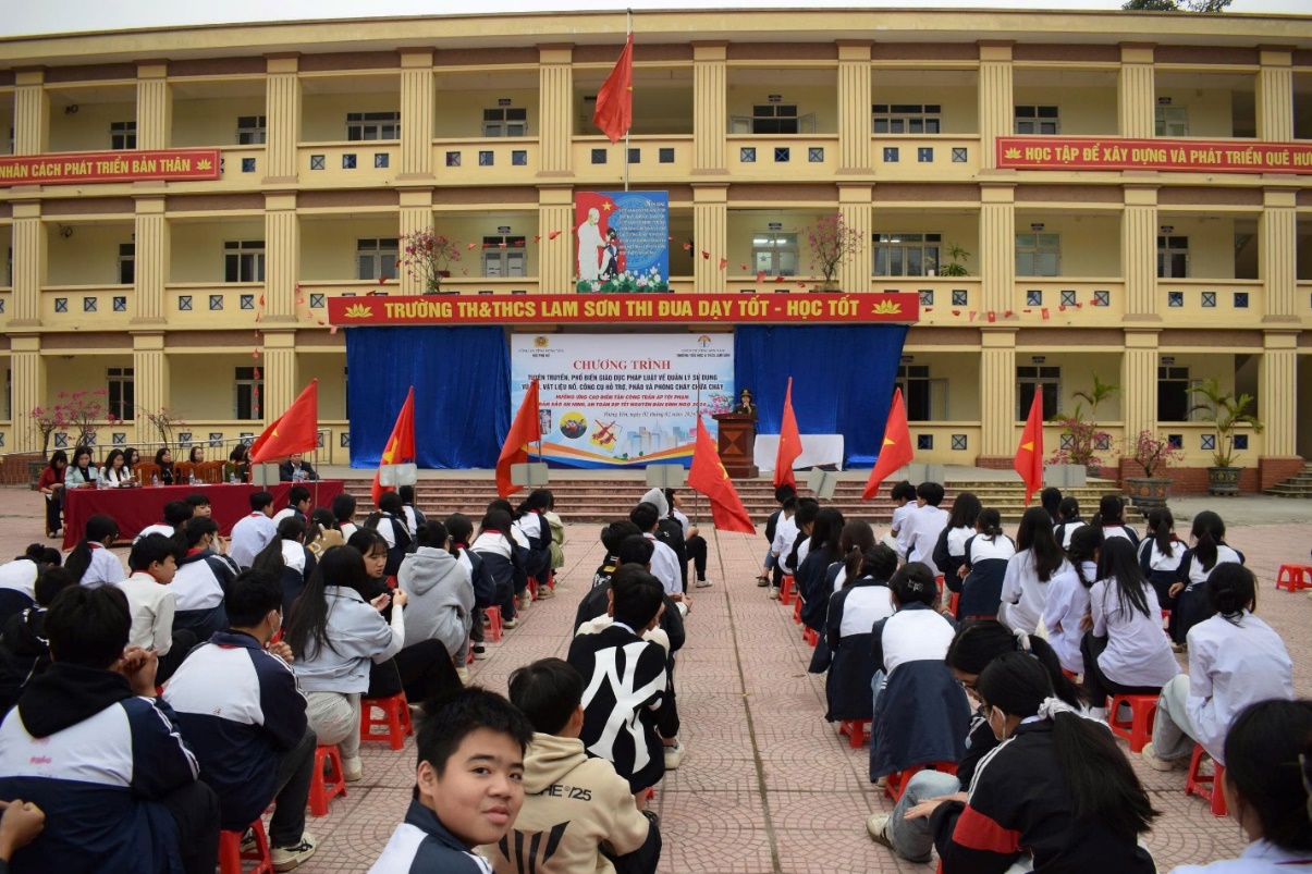 Thực hiện cao điểm tấn công, trấn áp tội phạm, bảo đảm an ninh, an toàn các sự kiện lớn của đất nước và Tết Nguyên đán Bính Ngọ 2026, ngày 02/02/2026, Hội Phụ nữ Công an tỉnh Hưng Yên phối hợp với Ban Giám hiệu Trường Tiểu học và THCS Lam Sơn tổ chức Chương trình tuyên truyền, phổ biến giáo dục pháp luật về quản lý, sử dụng vũ khí, vật liệu nổ, công cụ hỗ trợ, pháo và phòng cháy chữa cháy cho cán bộ, giáo viên và học sinh nhà trường.
