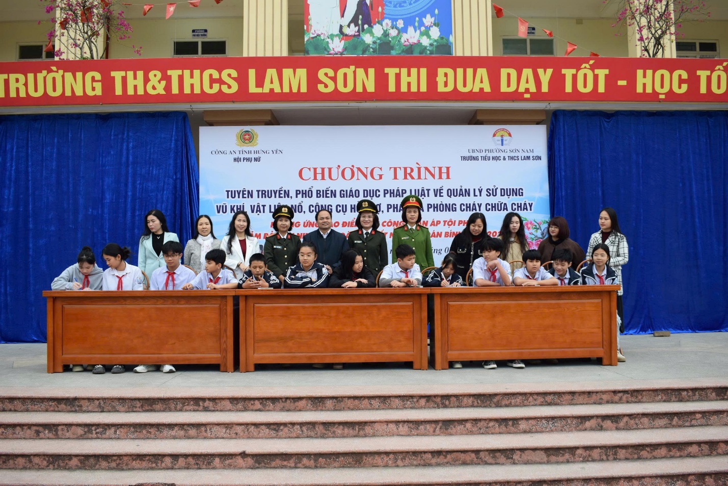 Đại diện học sinh Trường Tiểu học và THCS Lam Sơn ký cam kết chấp hành nghiêm các quy định của pháp luật về vũ khí, vật liệu nổ, công cụ hỗ trợ, pháo và an toàn phòng cháy, chữa cháy