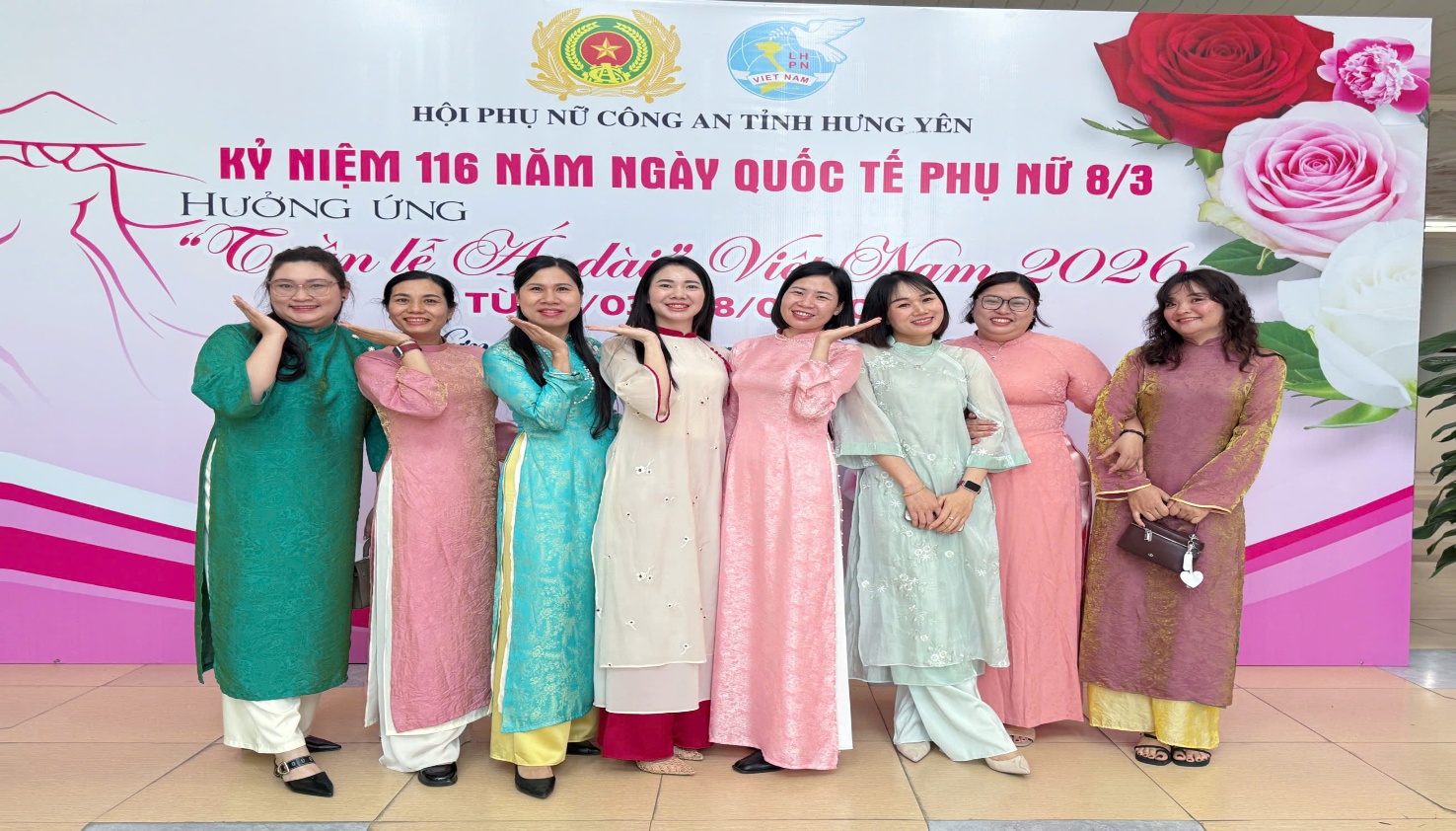 Trong không khí thi đua sôi nổi chào mừng ngày truyền thống của lực lượng và 116 năm ngày Quốc tế phụ nữ (8/3), Hội phụ nữ Phòng Cảnh sát hình sự cũng tích cực hưởng ứng “Tuần lễ Áo dài” do Ban phụ nữ Công an tỉnh phát động. Các hội viên đã tổ chức chụp ảnh lưu niệm trong trang phục áo dài tại khuôn viên Công an tỉnh và Hồ Bán Nguyệt, tỉnh Hưng Yên. Những tà áo dài thướt tha được chị em mang trên mình không chỉ tôn vinh vẻ đẹp duyên dáng của phụ nữ Việt Nam mà còn thể hiện hình ảnh người nữ chiến sỹ Công an vừa mạnh mẽ trong công tác, vừa dịu dàng, thanh lịch trong đời sống thường ngày.