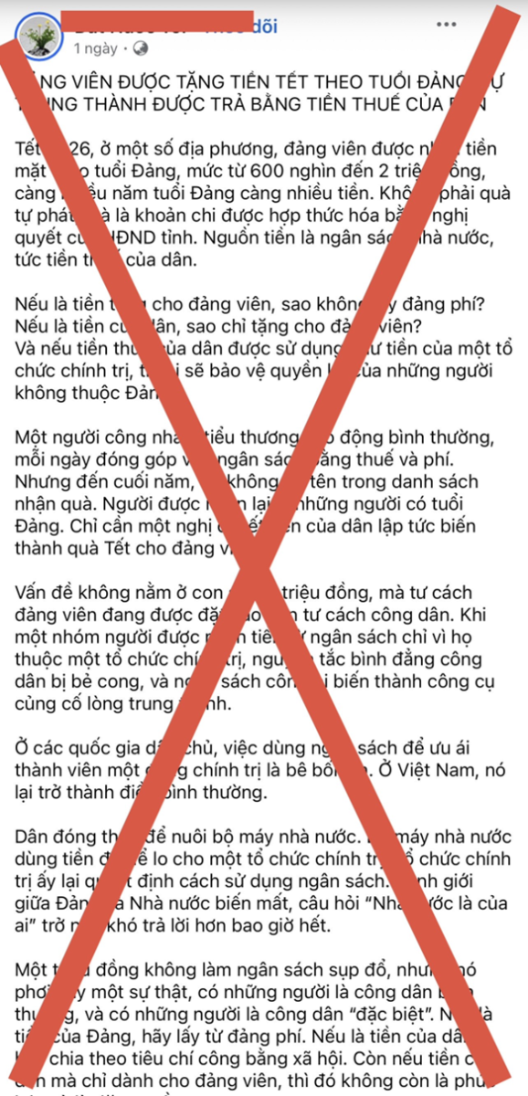 Trước những thông tin lan truyền trên mạng xã hội thời gian gần đây với nội dung xuyên tạc về việc chi tiền hỗ trợ, thăm hỏi đảng viên, lão thành cách mạng nhân dịp Tết Nguyên đán Bính Ngọ 2026, chúng ta cần giữ một cái nhìn tỉnh táo, khách quan và thấu đáo để không bị dẫn dắt bởi những luận điệu sai lệch, cố tình gây chia rẽ khối đại đoàn kết dân tộc. Những bài viết cố tình quy chụp việc tri ân những người có công với đất nước là "mua chuộc lòng trung thành" hay "bất bình đẳng" thực chất là một cách nhìn phiến diện, thiếu thiện chí và phủ nhận lịch sử, phủ nhận những giá trị nhân văn cốt lõi của dân tộc Việt Nam.