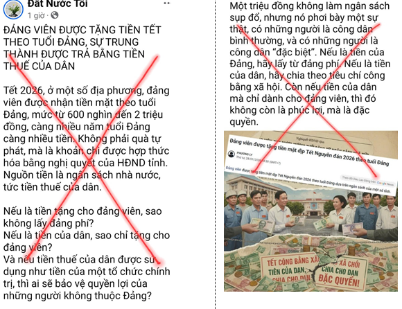 Gần đây, trên mạng xã hội xuất hiện các thông tin từ một số trang Facebook, điển hình như trang “Đất nước tôi”, đưa ra những luận điệu sai trái, xuyên tạc về việc một số địa phương tổ chức thăm hỏi, tặng quà đảng viên cao tuổi vào dịp Tết Nguyên đán 2026. Các đối tượng này cố tình cho rằng “đảng viên được trả tiền trung thành bằng tiền thuế của dân”, từ đó đặt ra những câu hỏi mang tính kích động như: “Nếu là tiền tặng cho đảng viên, sao không lấy từ đảng phí?” hoặc “Nếu là tiền của dân, sao chỉ tặng cho đảng viên?”.