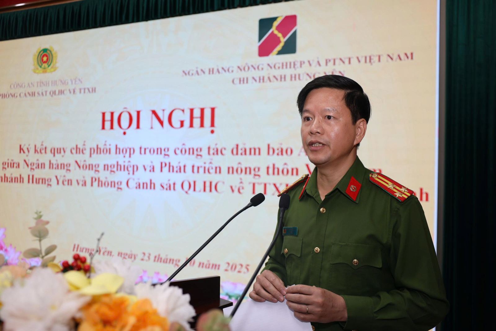 Chiều ngày 23/10/2025, Phòng Cảnh sát quản lý hành chính về trật tự xã hội Công an tỉnh (Phòng Cảnh sát QLHC về TTXH) tổ chức Hội nghị ký kết quy chế phối hợp với Ngân hàng Nông nghiệp và Phát triển nông thôn Việt Nam chi nhánh Hưng Yên (Ngân hàng Agribank). Dự buổi lễ có đồng chí Thượng tá Nguyễn Xuân Hải, Trưởng phòng Cảnh sát QLHC về TTXH, đồng chí Vũ Thanh Liêm, Giám đốc Ngân hàng Agribank.
