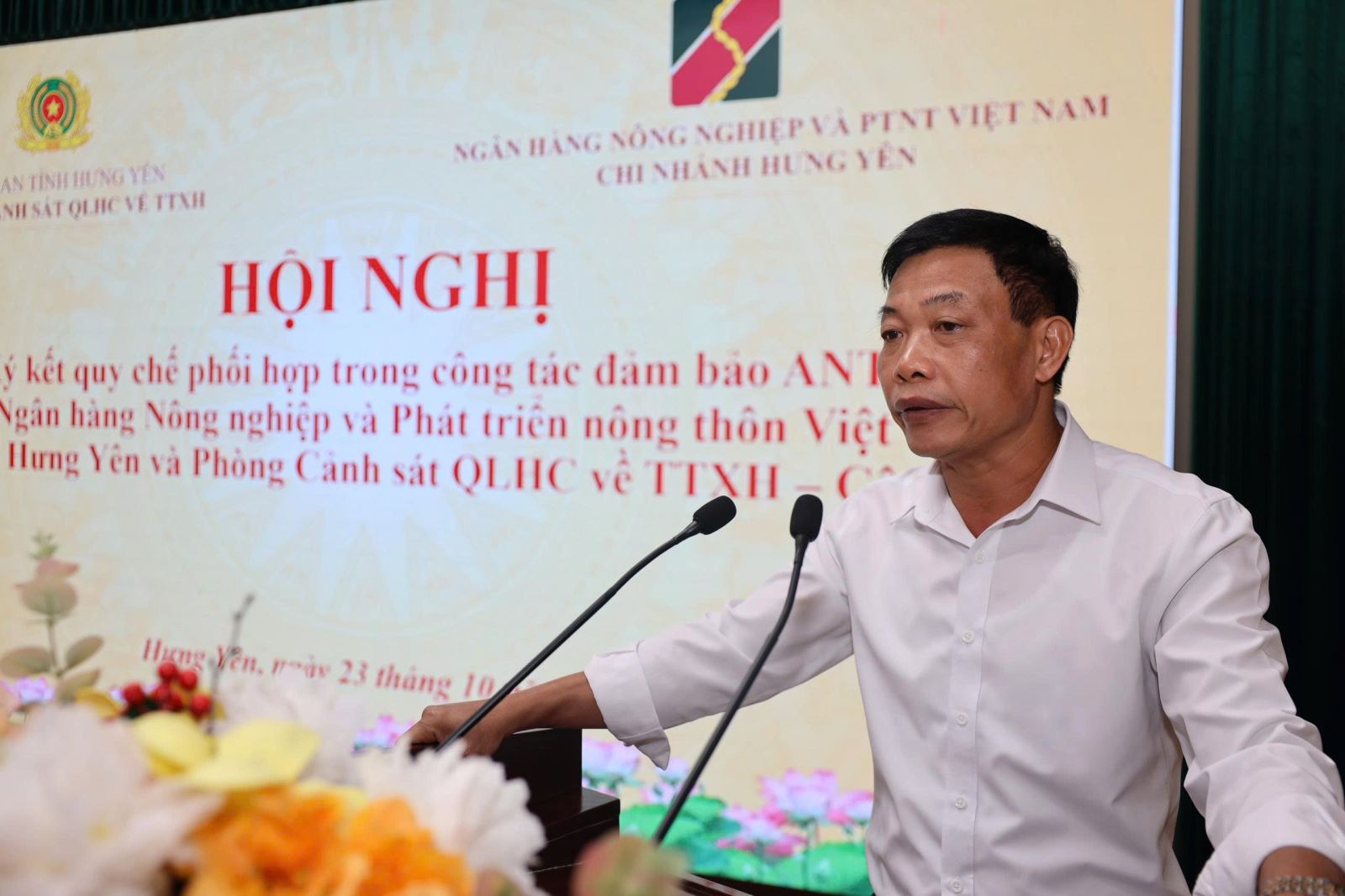 Phát biểu tại lễ ký kết, đồng chí Thượng tá Nguyễn Xuân Hải, Trưởng Phòng Cảnh sát QLHC về TTXH khẳng định, sự phối hợp của các cơ quan, doanh nghiệp trên địa bàn tỉnh nói chung, Ngân hàng Agribank nói riêng là rất quan trọng nhằm chủ động phòng ngừa từ sớm, từ xa; kịp thời ngăn chặn các tình huống có thể xảy ra, bảo đảm an ninh, an toàn tính mạng, tài sản cho người dân và cán bộ, nhân viên của ngân hàng. Đồng thời tích cực phối hợp với các đơn vị chức năng thường xuyên tiến hành công tác tuần tra, kiểm soát bảo đảm an ninh, trật tự tại địa bàn đặt trụ sở, tài sản của Ngân hàng Agribank Hưng Yên và các chi nhánh, phòng giao dịch, góp phần giữ vững an ninh, trật tự trên địa bàn tỉnh.