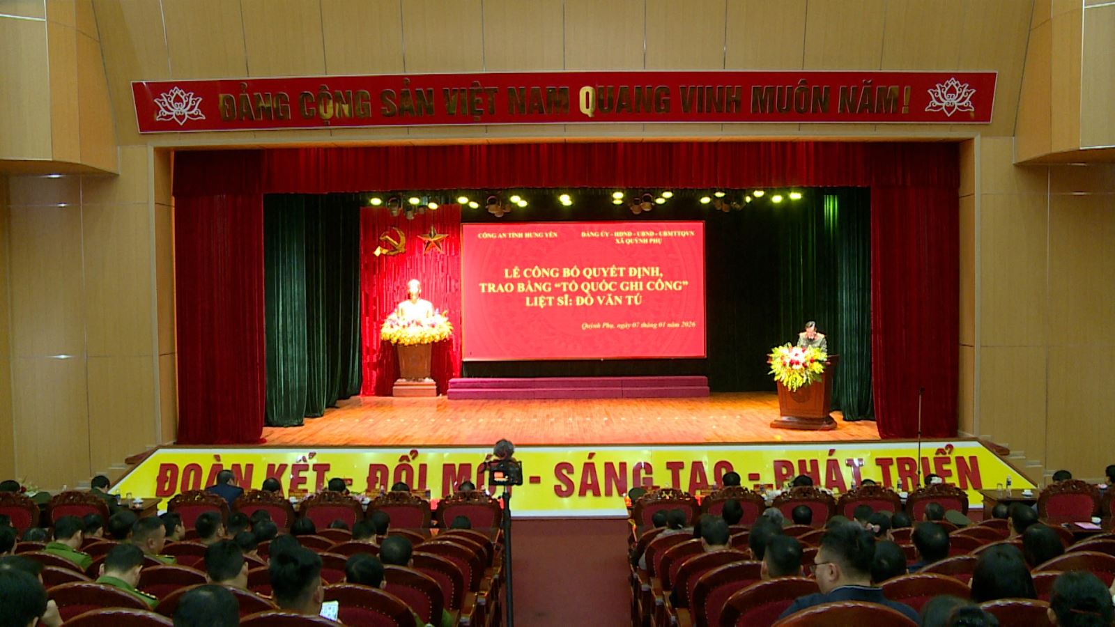 Ngày 07/01/2026, Công an tỉnh Hưng Yên chủ trì, phối hợp Sở Nội vụ và chính quyền địa phương tổ chức Lễ Công bố Quyết định và trao Bằng “Tổ quốc ghi công” đối với liệt sĩ Đỗ Văn Tú, nguyên cán bộ Công an thị trấn An Bài, huyện Quỳnh Phụ, tỉnh Thái Bình (nay là Công an xã Phụ Dực, tỉnh Hưng Yên). Đồng chí Đại tá Nguyễn Thành Sơn, Phó Bí thư Đảng ủy, Phó Giám đốc Công an tỉnh Hưng Yên chủ trì buổi lễ. Cùng dự có đại diện Lãnh đạo Sở Nội vụ; đại diện Đảng ủy, HĐND, UBND xã Quỳnh Phụ; đại diện Công an các đơn vị địa phương; Cấp ủy, Chi bộ và Nhân dân thôn An Phú 2, xã Quỳnh Phụ và Gia đình liệt sĩ Đỗ Văn Tú.
