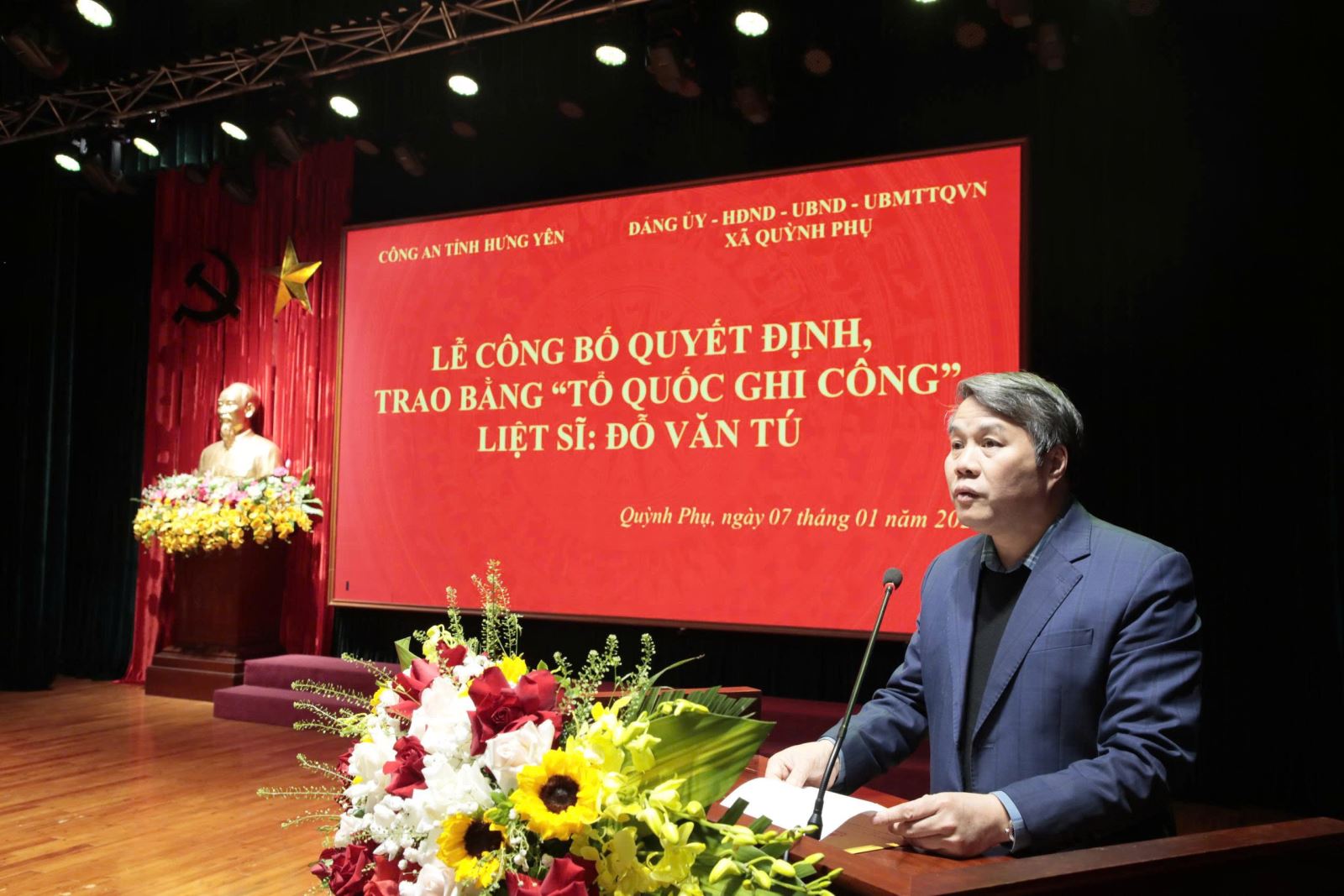 Đại diện Lãnh đạo phòng Tổ chức cán bộ Công an tỉnh Hưng Yên công bố Quyết định của Thủ tướng Chính phủ về cấp Bằng “Tổ quốc ghi công” đối với liệt sĩ Đỗ Văn Tú