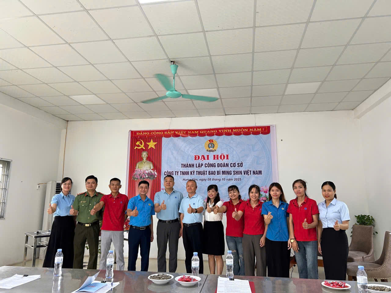 Ngày 08/10/2025 tại phòng An ninh kinh tế phối hợp với Liên đoàn lao động tỉnh Hưng Yên và Công ty TNHH kỹ thuật Bao bì Ming Shin (công ty có 100% vốn đầu tư nước ngoài); địa chỉ: là thôn Giai Lệ, xã Tiên Hoa, tỉnh Hưng Yên tổ chức Đại hội thành lập Công đoàn cơ sở, với sự tham gia của Ban lãnh đạo Công ty và 89 người lao động. Kết quả tại Đại hội đã bầu Ban chấp hành khóa I, nhiệm kỳ 2025 – 2030 gồm 05 đồng chí; Bầu 01 đ/c Chủ tịch, 01 đ/c Phó chủ tịch Công đoàn, đây là những nhân tố nòng cốt để thực hiện tốt các chức năng, nhiệm vụ của Công đoàn cơ sở, chăm lo, bảo vệ quyền lợi cho người lao động, góp phần giúp Công ty hoạt động ổn định, ngày càng phát triển trong thời gian tới.