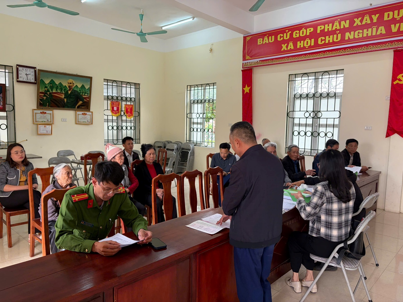 Đồng chí Trung tá Trần Anh Nam - Phó Trưởng Công an xã phối hợp với các ban, ngành, đoàn thể đẩy mạnh công tác tuyên truyền, định hướng dư luận tại điểm bầu cử thôn Đống Long, xã Hiệp Cường