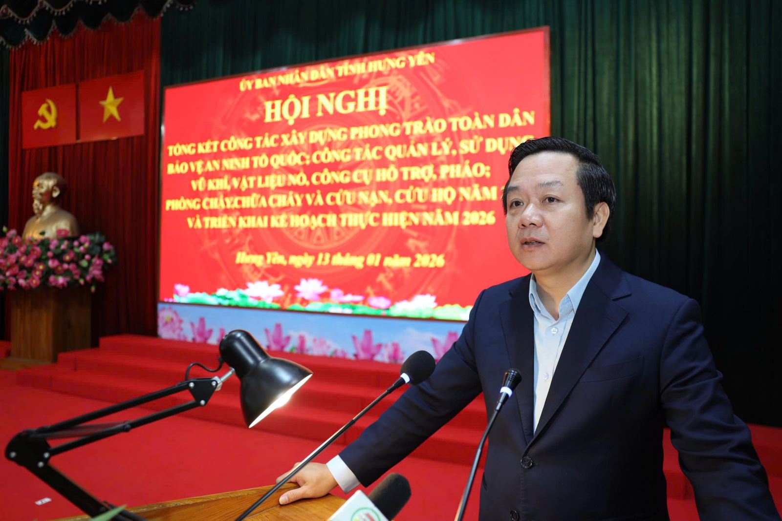Đồng chí Phó Bí thư Tỉnh ủy, Chủ tịch UBND tỉnh phát biểu tại Hội nghị Tổng kết Công tác xây dựng phong trào toàn dân bảo vệ an ninh Tổ quốc; công tác quản lý, sử dụng vũ khí, vật liệu nổ, công cụ hỗ trợ, pháo; phòng cháy, chữa cháy và cứu nạn, cứu hộ năm 2025 và triển khai kế hoạch thực hiện năm 2026 do Ủy ban nhân dân tỉnh tổ chức.