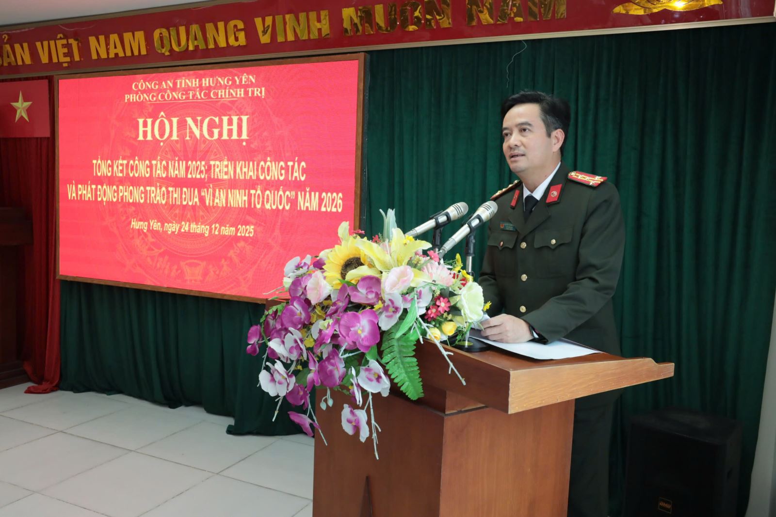 Ngày 24/12/2025, Phòng Công tác chính trị Công an tỉnh tổ chức Hội nghị tổng kết công tác năm 2025, triển khai phong trào thi đua “Vì An ninh Tổ quốc” năm 2026. Dự và chỉ đạo hội nghị có đồng chí Đại tá Nguyễn Thành Sơn, Phó Bí thư Đảng ủy, Phó Giám đốc Công an tỉnh; đại diện lãnh đạo phòng Tham mưu; lãnh đạo và cán bộ chiến sỹ đơn vị.