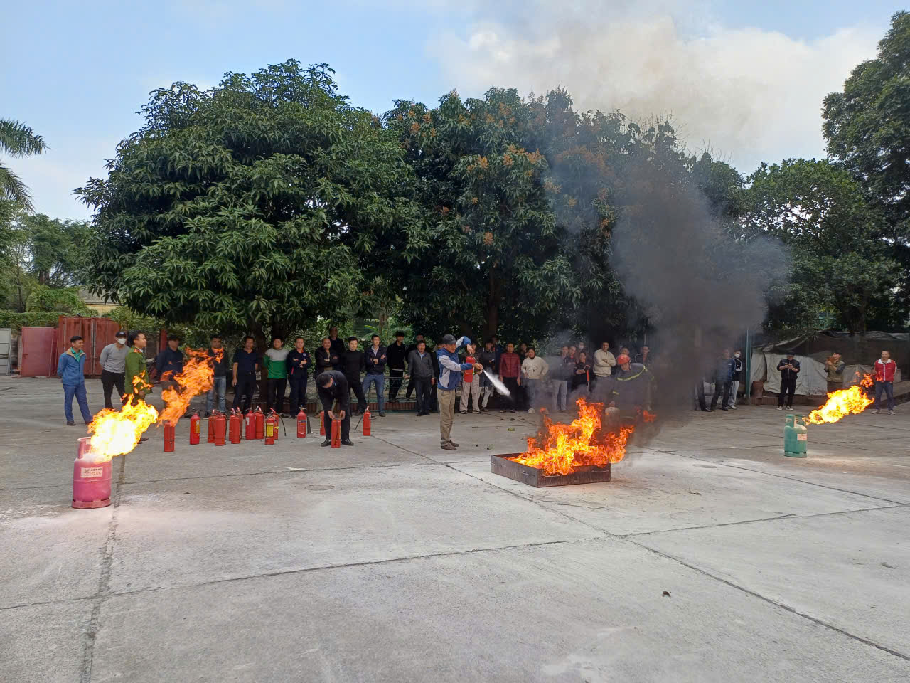 Song song với việc được tuyên truyền miệng về kiến thức pháp luật, các thành viên Đội PCCC cơ sở còn được hướng dẫn trực tiếp tham gia thực hành xử lý tình huống cháy giả định, thao tác sử dụng phương tiện chữa cháy, dập tắt đám cháy xăng dầu, đám cháy gas….