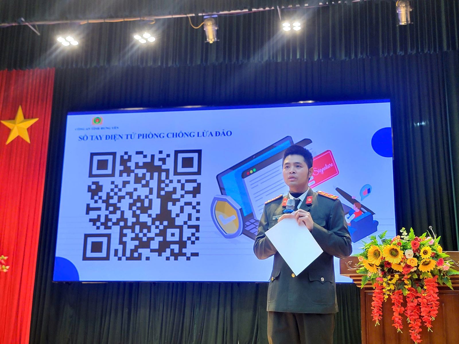 Đồng chí báo cáo viên giới thiệu mô hình “Sổ tay điện tử phòng, chống lừa đảo”
