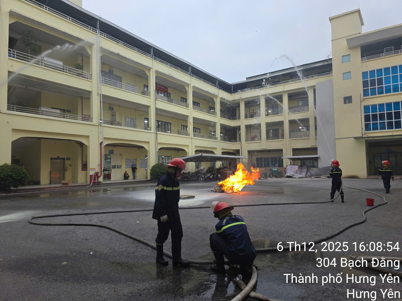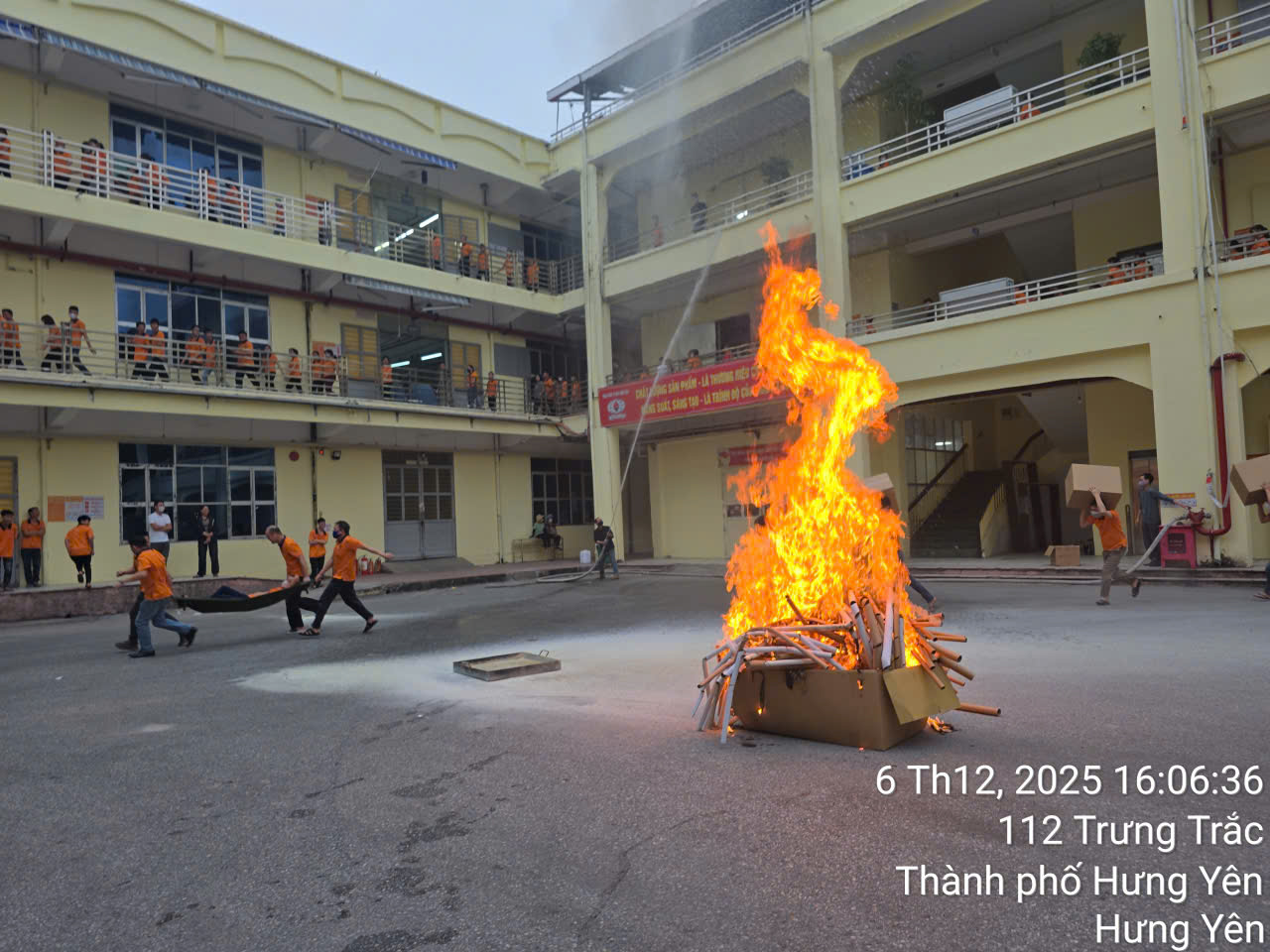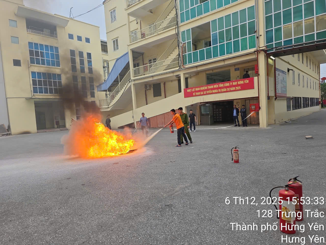 Cũng trong ngày 06/12/2025, thực hiện kế hoạch số 338/KH-CẢNH SÁT PCCC VÀ CNCH ngày 02/12/2025 của Phòng Cảnh sát PCCC&CNCH - Công an tỉnh Hưng Yên về tổ chức thực tập phương án chữa cháy của cơ quan Công an tại Tổng công ty may Hưng Yên - CTCP. Tham gia thực tập phương án có tổng số 01 phương tiện cơ giới với 08 CBCS Đội chữa cháy và cứu nạn, cứu hộ Trung tâm - Phòng CẢNH SÁT PCCC VÀ CNCH, Công an tỉnh Hưng yên và 25 người là Đội viên đội PCCC&CNCH, 300 cán bộ, công nhân viên Tổng công ty may Hưng Yên – CTCP tham gia thực tập phương án chữa cháy và cứu nạn, cứu hộ với tình huống giả định tại khu vực nhà kho, trưng bày sản phẩm của công ty.