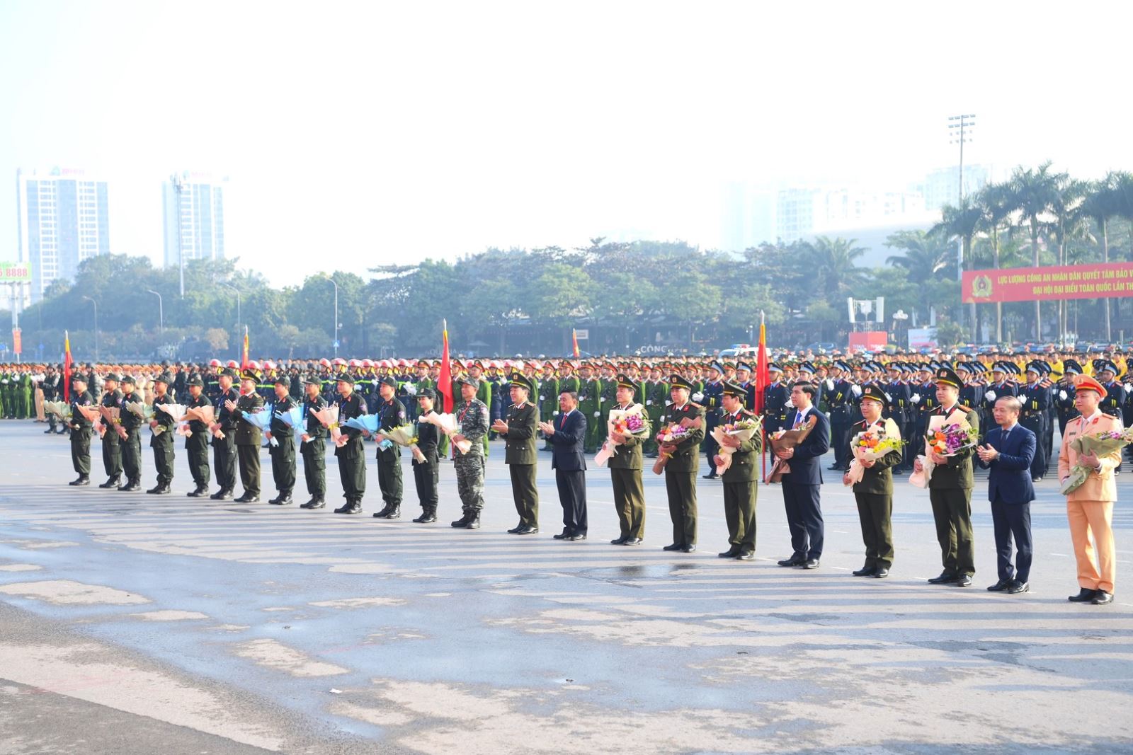 Dự Lễ xuất quân có đại diện lãnh đạo các ban, bộ, ngành Trung ương, Thành ủy, Ủy ban nhân dân thành phố Hà Nội; đại diện lãnh đạo Công an các đơn vị, địa phương cùng gần 5.000 cán bộ, chiến sĩ Công an nhân dân đại diện cho các lực lượng trực tiếp tham gia đảm bảo ANTT Đại hội XIV của Đảng.