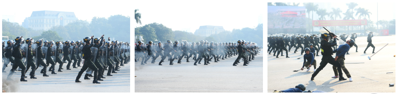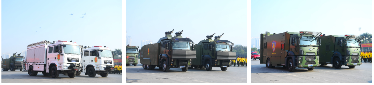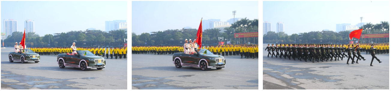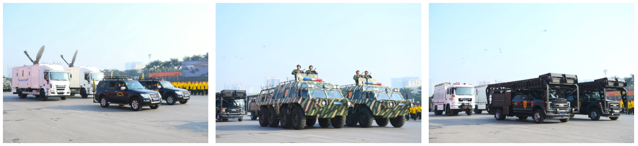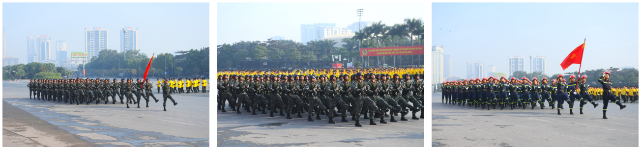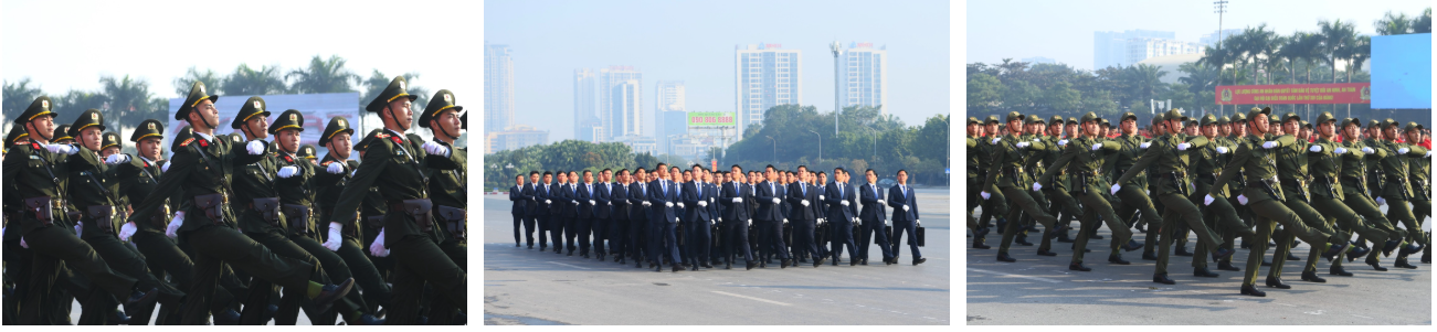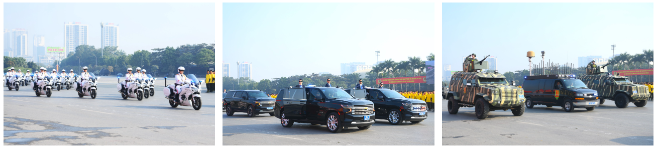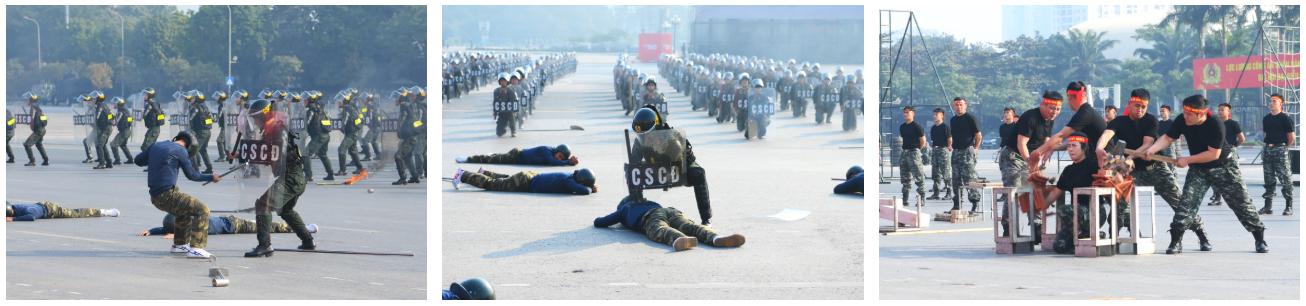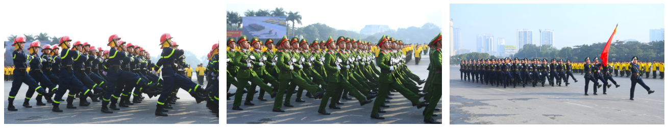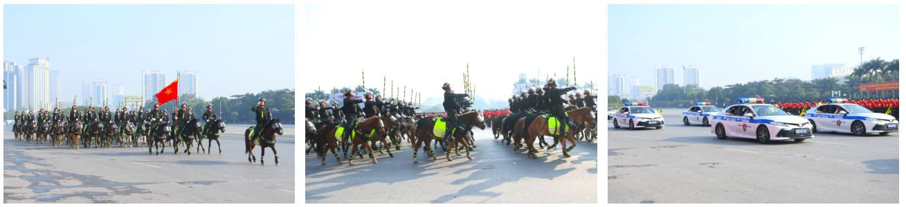 Ngay sau đó là chương trình duyệt đội ngũ, diễu hành phương tiện đặc chủng của Bộ Công an và lực lượng trực thăng thuộc Trung đoàn Không quan 916, Sư đoàn Không quân 371, Quân chủng Phòng không – Không quân – Bộ Quốc phòng; báo cáo kết quả huấn luyện các nội dung thực hiện phương án bảo đảm ANTT với các nội dung đồng diễn Bài Quyền dùi cui, lá chắn, nội dung khí công, công phá, bắn súng ứng dụng…