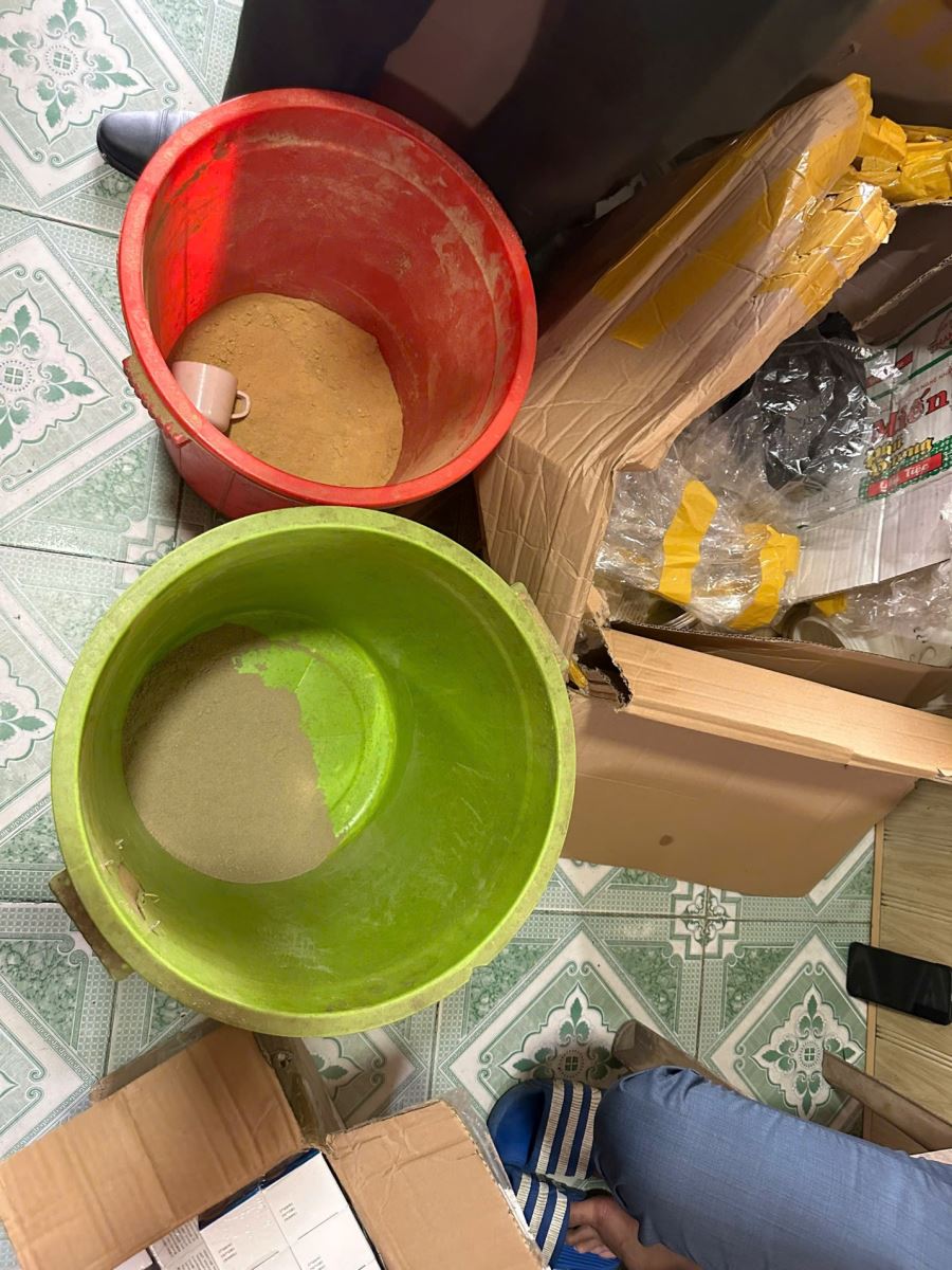Thuốc chưa thành phẩm được đựng trong các thùng sơn bẩn, cũ