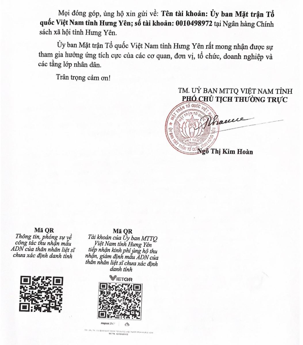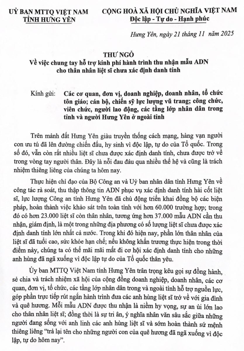 Thư ngỏ của Ủy ban Mặt trận Tổ quốc Việt Nam tỉnh về việc chung tay hỗ trợ kinh phí hành trình thu nhận mẫu ADN cho thân nhân liệt sĩ chưa xác định danh tính