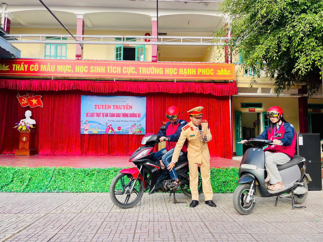 Đội Cảnh sát giao thông đường bộ số 3 – Phòng Cảnh sát giao thông công an tỉnh Hưng Yên đã phối hợp cùng Ban Giám hiệu trường THPT Lạc Long Quân tổ chức buổi tuyên truyền, thực hành kỹ năng điều khiển phương tiện tham gia giao thông cho giáo viên và học sinh nhà trường, nhằm trang bị cho các em những kiến thức cần thiết về Luật trật tự, an toàn giao thông đường bộ, rèn luyện kỹ năng điều khiển phương tiện an toàn, đúng kỹ thuật, góp phần phòng ngừa tai nạn và xây dựng văn hóa giao thông học đường văn minh, an toàn.