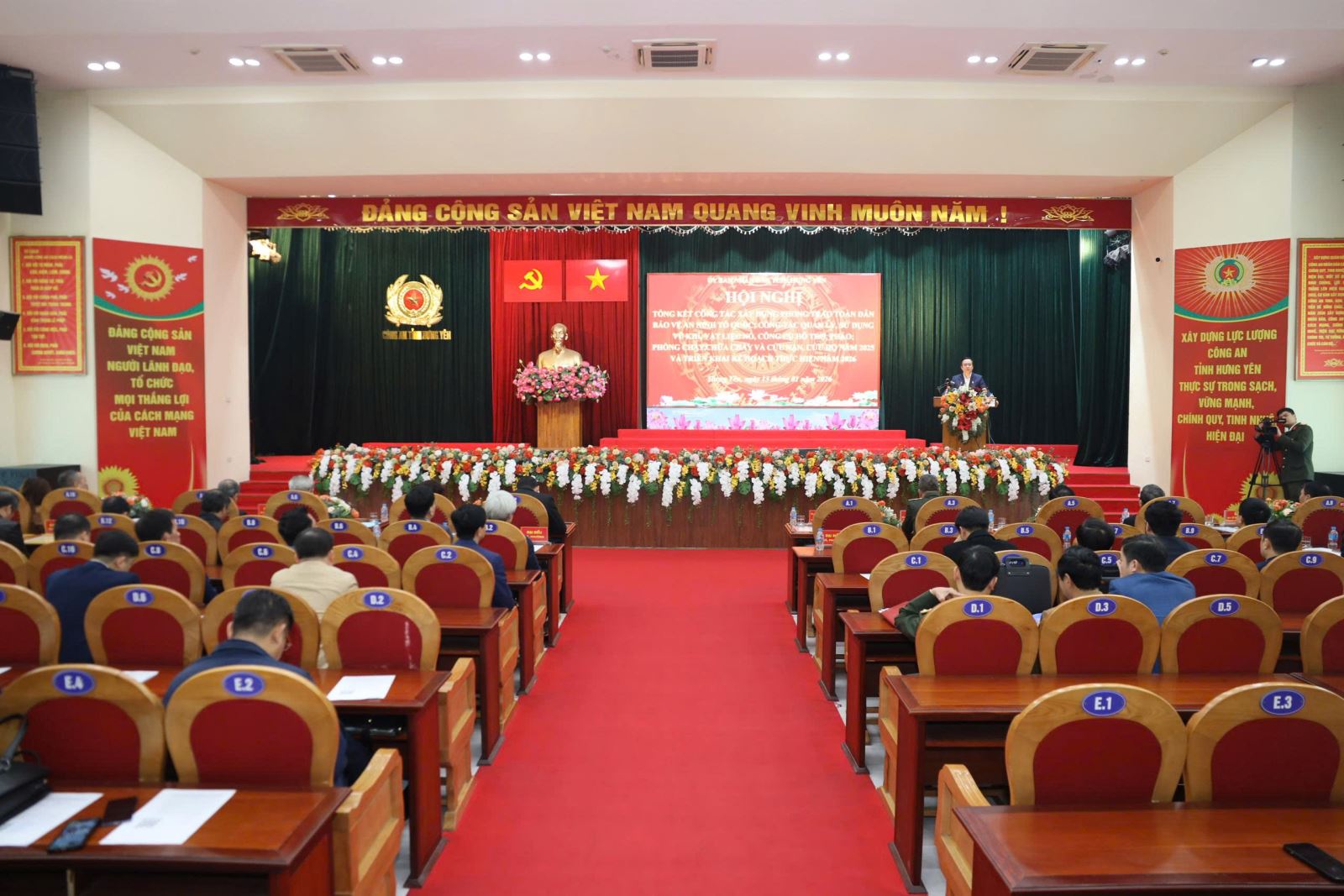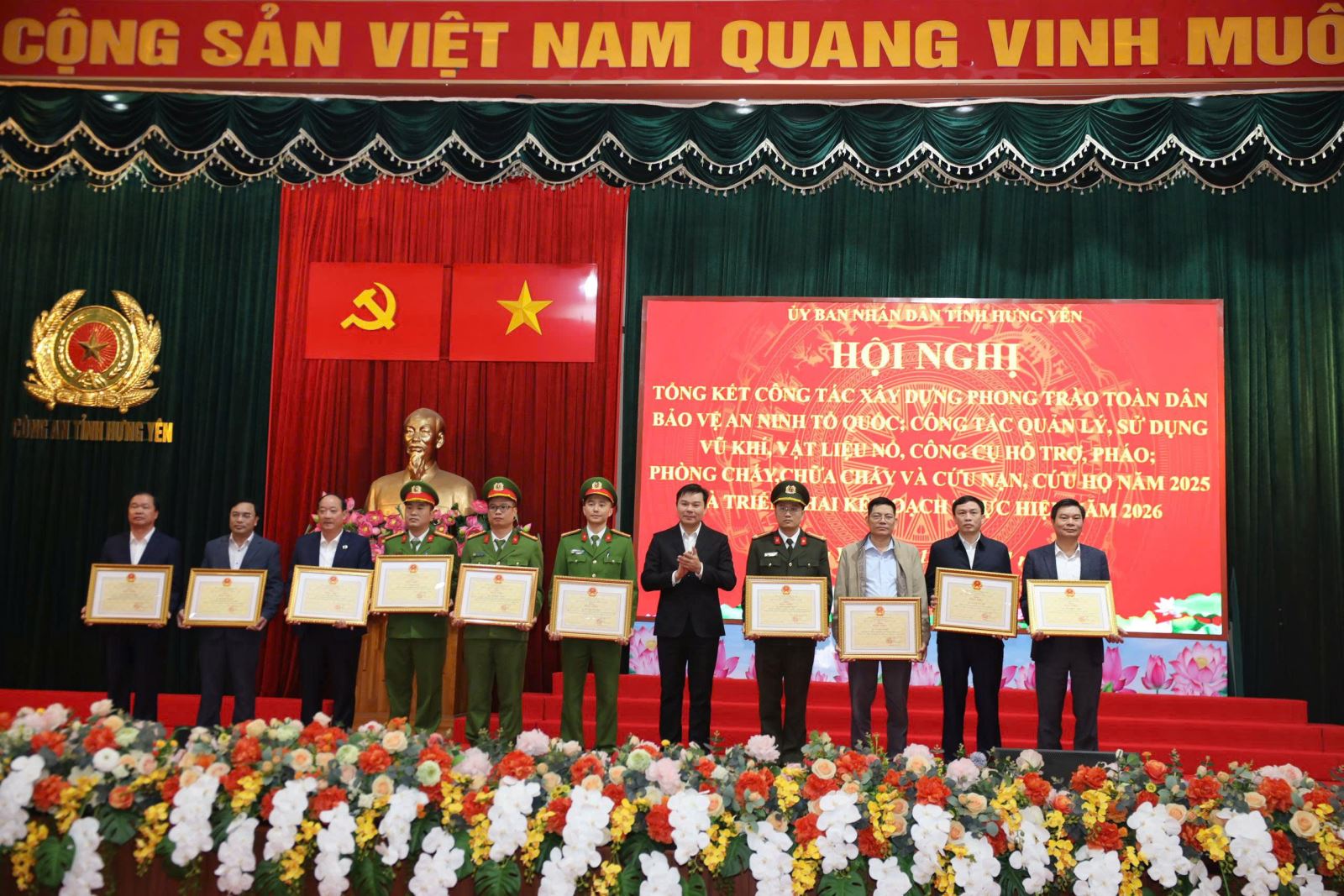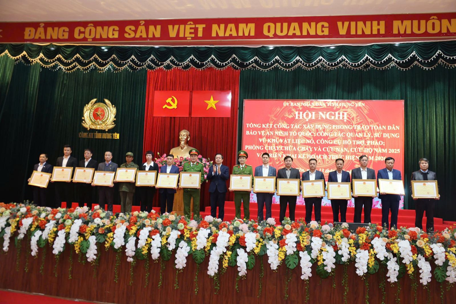 Ngày 13/01/2026, tại Công an tỉnh, UBND tỉnh Hưng Yên tổ chức hội nghị tổng kết công tác xây dựng phong trào toàn dân bảo vệ an ninh Tổ quốc; công tác quản lý, sử dụng vũ khí, vật liệu nổ, công cụ hỗ trợ, pháo; phòng cháy, chữa cháy và cứu nạn, cứu hộ năm 2025 và triển khai kế hoạch thực hiện năm 2026. Dự hội nghị có các đồng chí: Phạm Quang Ngọc, Phó Bí thư Tỉnh ủy, Chủ tịch UBND tỉnh; Nguyễn Lê Huy, Ủy viên Ban Thường vụ Tỉnh ủy, Phó Chủ tịch Thường trực UBND tỉnh, Trưởng Ban chỉ đạo thực hiện phong trào toàn dân bảo vệ An ninh Tổ quốc tỉnh, Ban chỉ đạo vận động toàn dân giao nộp vũ khí, công cụ hỗ trợ tỉnh, Ban chỉ đạo phòng cháy chữa cháy và cứu nạn cứu hộ tỉnh; Thiếu tướng Trần Xuân Ánh, Ủy viên Ban Thường vụ Tỉnh ủy, Giám đốc Công an tỉnh; đại diện lãnh đạo các sở, ngành của tỉnh; đại diện các doanh nghiệp, cơ quan, đơn vị, địa phương.