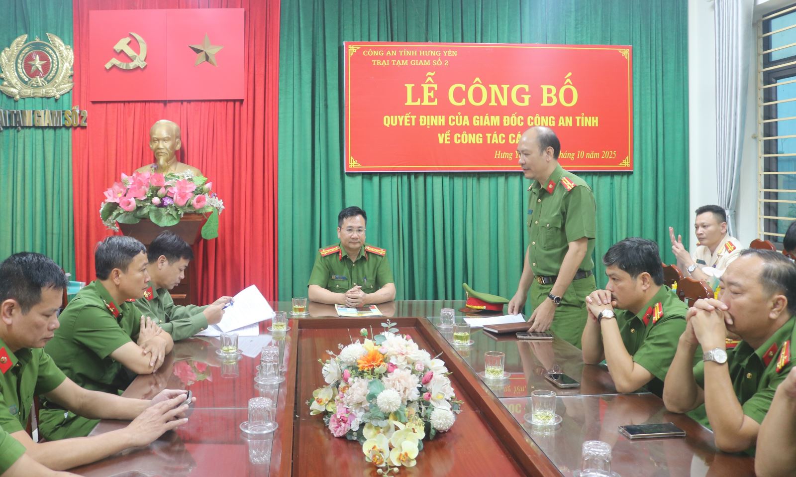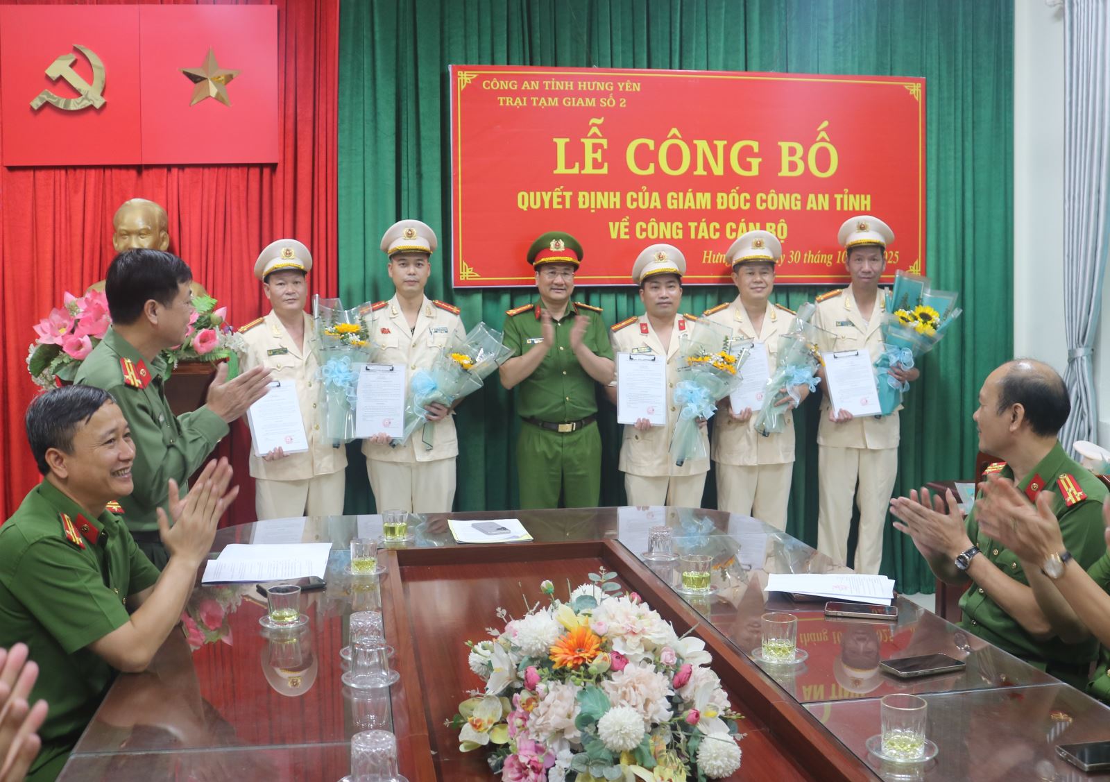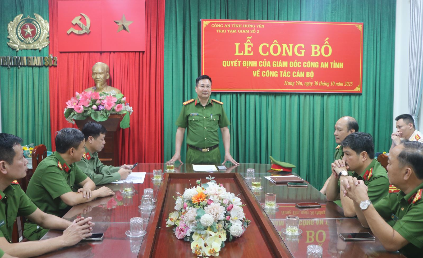 Chiều ngày 30/10/2025 tại Trại tạm giam số 2 - Công an tỉnh Hưng Yên đã long trọng tổ chức Lễ công bố các Quyết định của Giám đốc Công an tỉnh về công tác cán bộ. Buổi Lễ có sự chủ trì của đồng chí Đại tá Phạm Thanh Tiến – Phó Giám đốc Công an tỉnh; sự tham gia của đại diện lãnh đạo phòng Tổ chức cán bộ; sự có mặt của Đảng ủy, Lãnh đạo và chỉ huy các đội công tác, phân trại tạm giam - Trại tạm giam số 2.