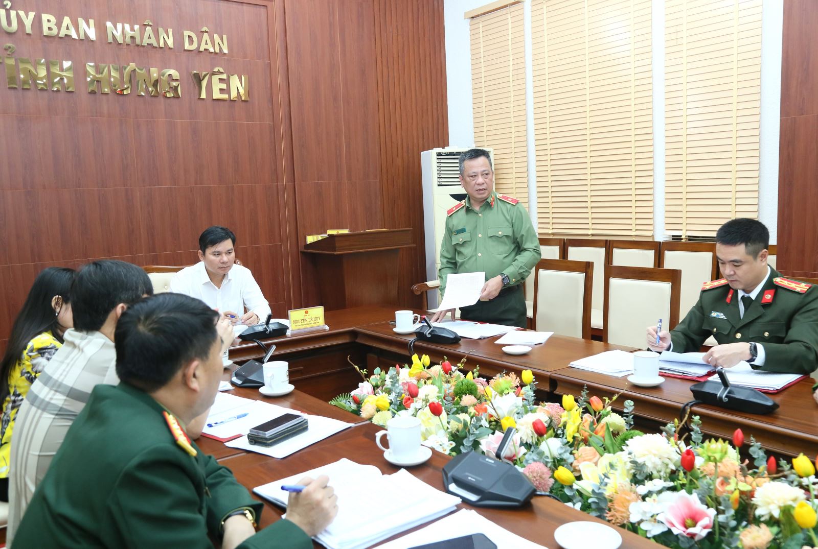 Đồng chí Giám đốc Công an tỉnh, Phó trưởng tiểu ban phát biểu tại cuộc họp