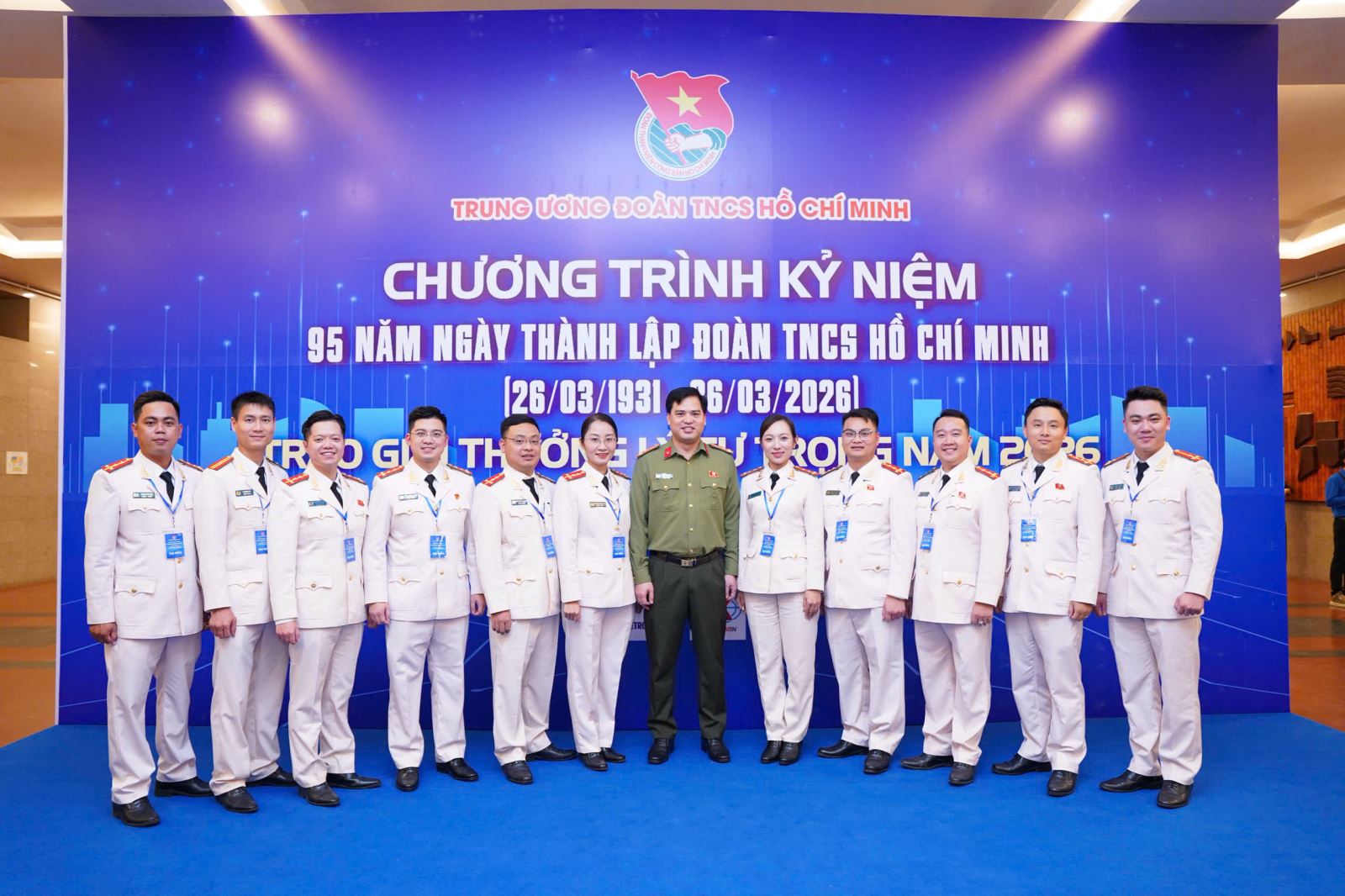 Đồng chí Thượng tá Đồng Đức Vũ - Uỷ viên BTV TW Đoàn, Trưởng Ban Thanh niên CAND chụp ảnh cùng các đại biểu lực lượng CAND đạt Giải thưởng Lý Tự Trọng năm 2026