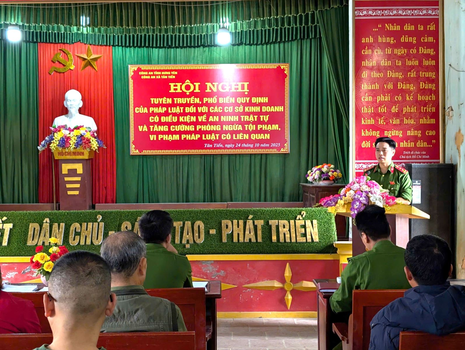 Sáng ngày 24/10/2025, Công an xã Tân Tiến tổ chức hội nghị tuyên truyền pháp luật đối với 38 cơ sở ngành nghề đầu tư kinh doanh có điều kiện về ANTT trên địa bàn xã. Hội nghị nhằm tăng cường công tác quản lý đối với ngành nghề đầu tư kinh doanh có điều kiện về an ninh trật tự, nâng cao trách nhiệm của chủ cơ sở kinh doanh; đồng thời lắng nghe những tâm tư, nguyện vọng, tháo gỡ khó khăn, vướng mắc trong quá trình kinh doanh, bảo đảm các cơ sở kinh doanh hoạt động đúng quy định của pháp luật, cũng như phòng ngừa vi phạm pháp luật tại các cơ sở.