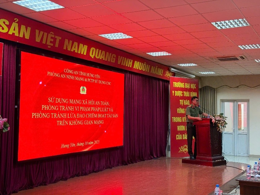 Ngày 30/10/2025, Phòng An ninh mạng và phòng chống tội phạm sử dụng công nghệ cao Công an tỉnh Hưng Yên đã phối hợp cùng Bệnh viện Đại học y Thái Bình tổ chức hoạt động tuyên truyền chuyên đề "Sử dụng mạng xã hội an toàn, phòng tránh vi phạm pháp luật và phòng tránh lừa đảo chiếm đoạt tài sản trên không gian mạng" cho gần 150 cán bộ của bệnh viện.