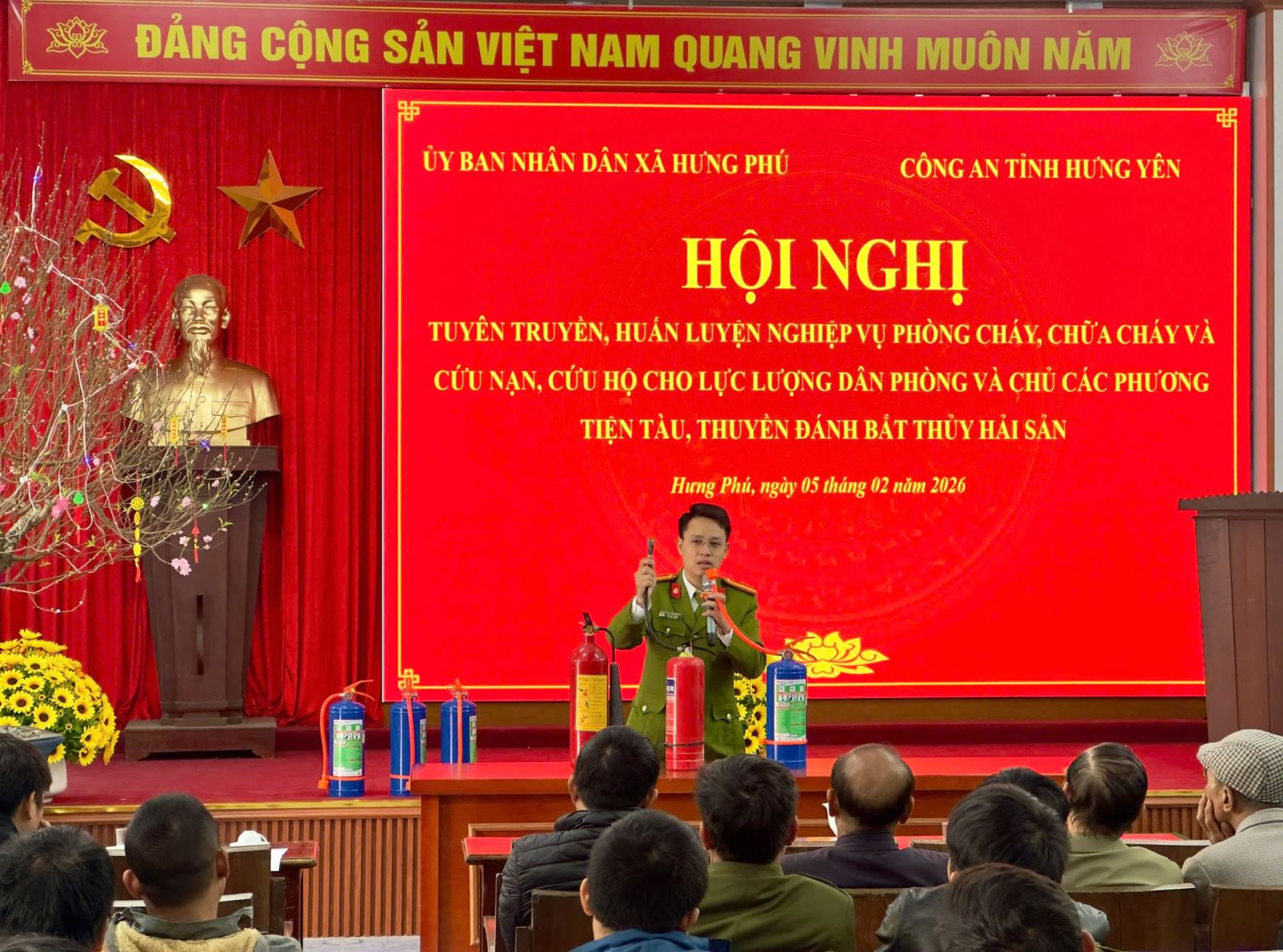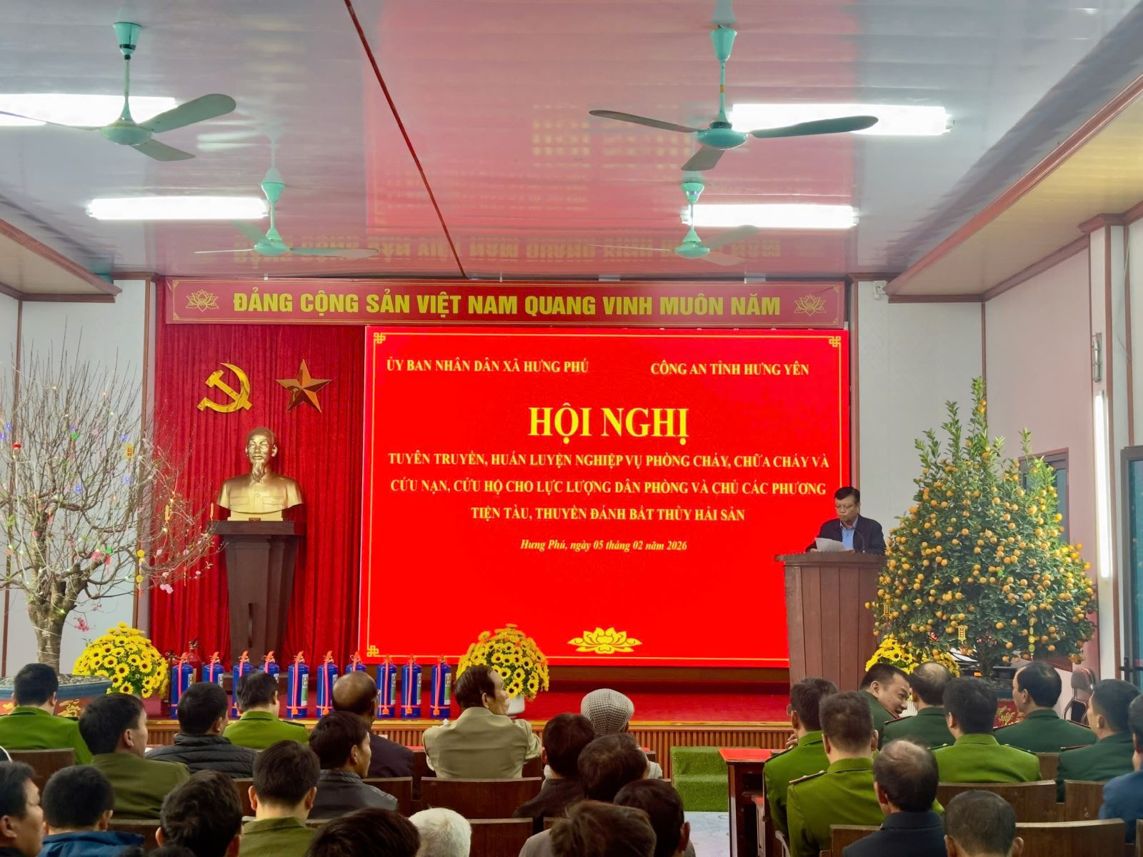 Sáng ngày 05/02/2026, Đội Chữa cháy và cứu nạn cứu hộ, khu vực Tiền Hải - Phòng Cảnh sát PCCC và CNCH (PCCC và CNCH), Công an tỉnh Hưng Yên phối hợp với UBND và Công an xã Hưng Phú tổ chức Hội nghị tuyên truyền, tập huấn, bồi dưỡng nghiệp vụ phòng cháy, chữa cháy và cứu nạn, cứu hộ trên địa bàn xã. Tham gia hội nghị có 169 chủ phương tiện đánh bắt thủy, hải sản và lực lượng dân phòng, lực lượng bảo vệ ANTT tại cơ sở trên địa bàn xã Hưng Phú.