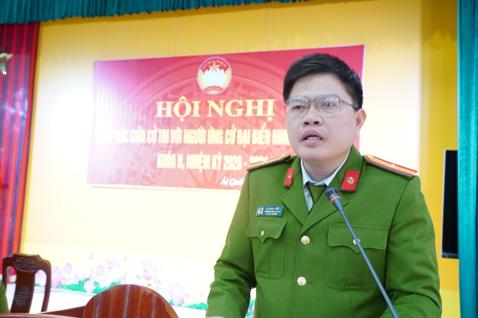 Đồng chí Thiếu tá Đỗ Minh Tuấn – Trưởng Công an xã Ái Quốc phát biểu tại Hội nghị tiếp xúc cử tri vận động bầu cử đại biểu Hội đồng nhân dân xã khóa II, nhiệm kỳ 2026–2031 tại đơn vị bầu cử số 1