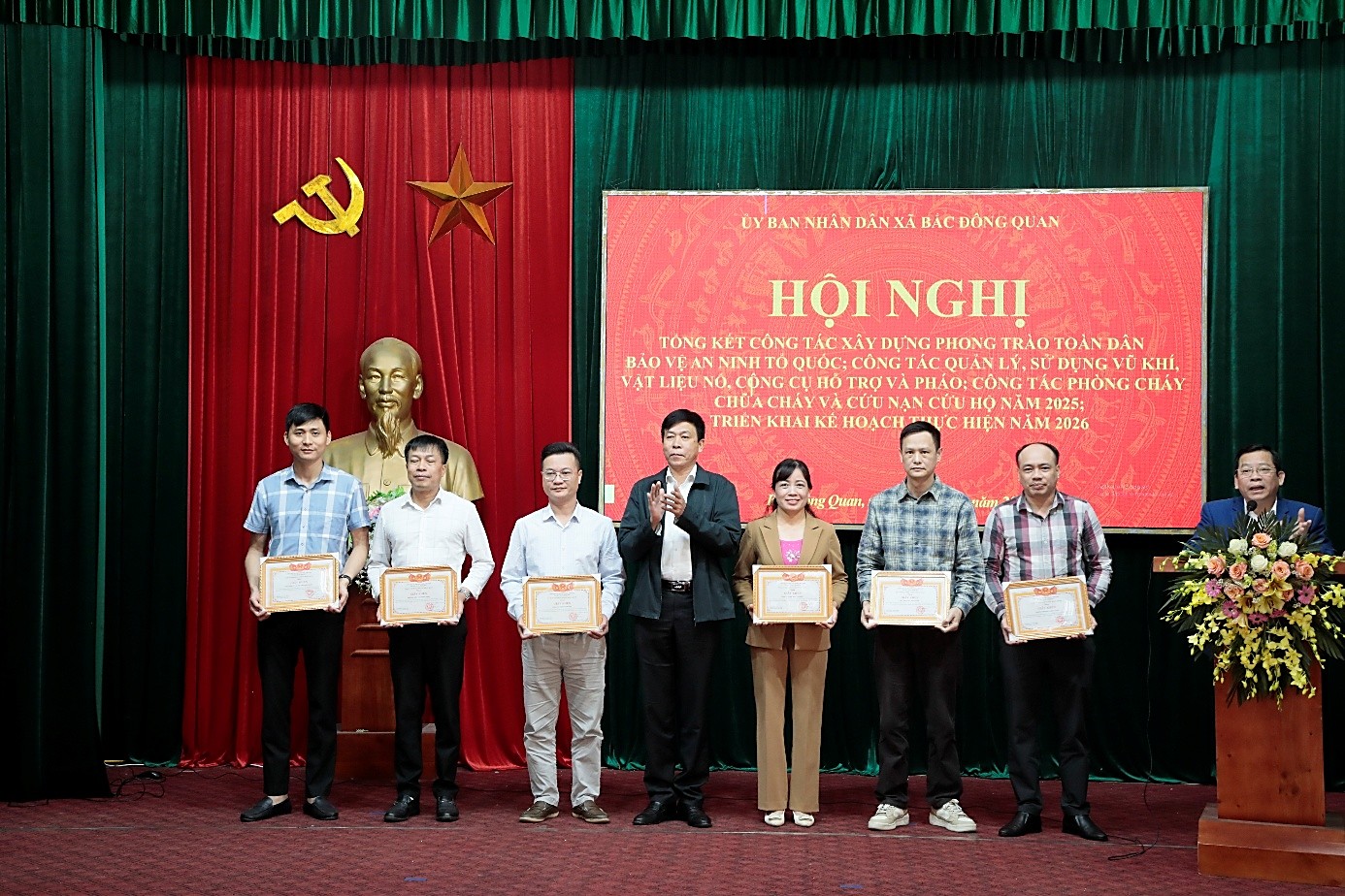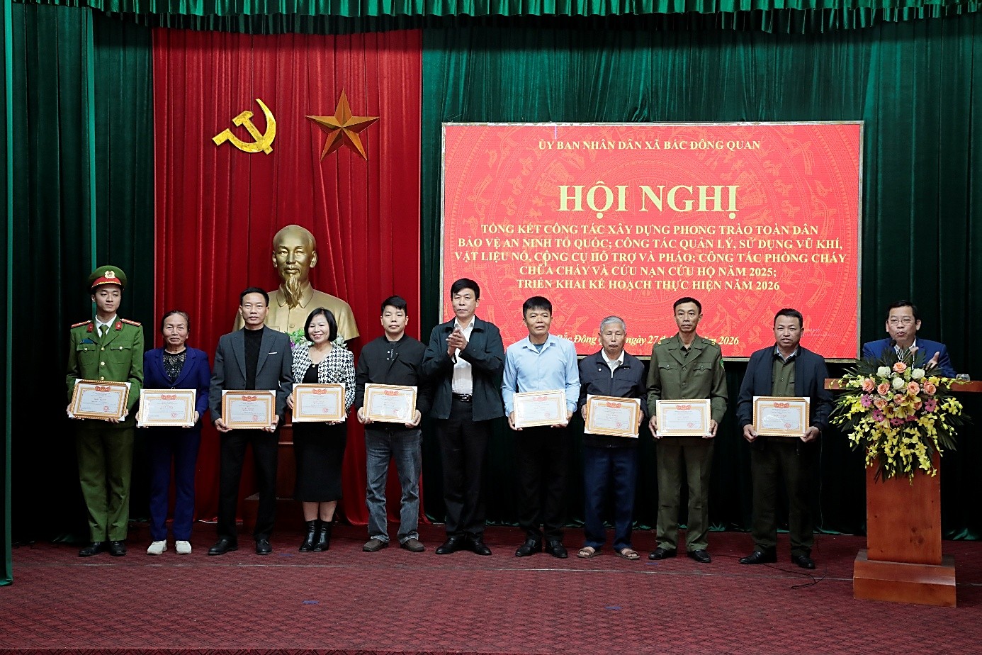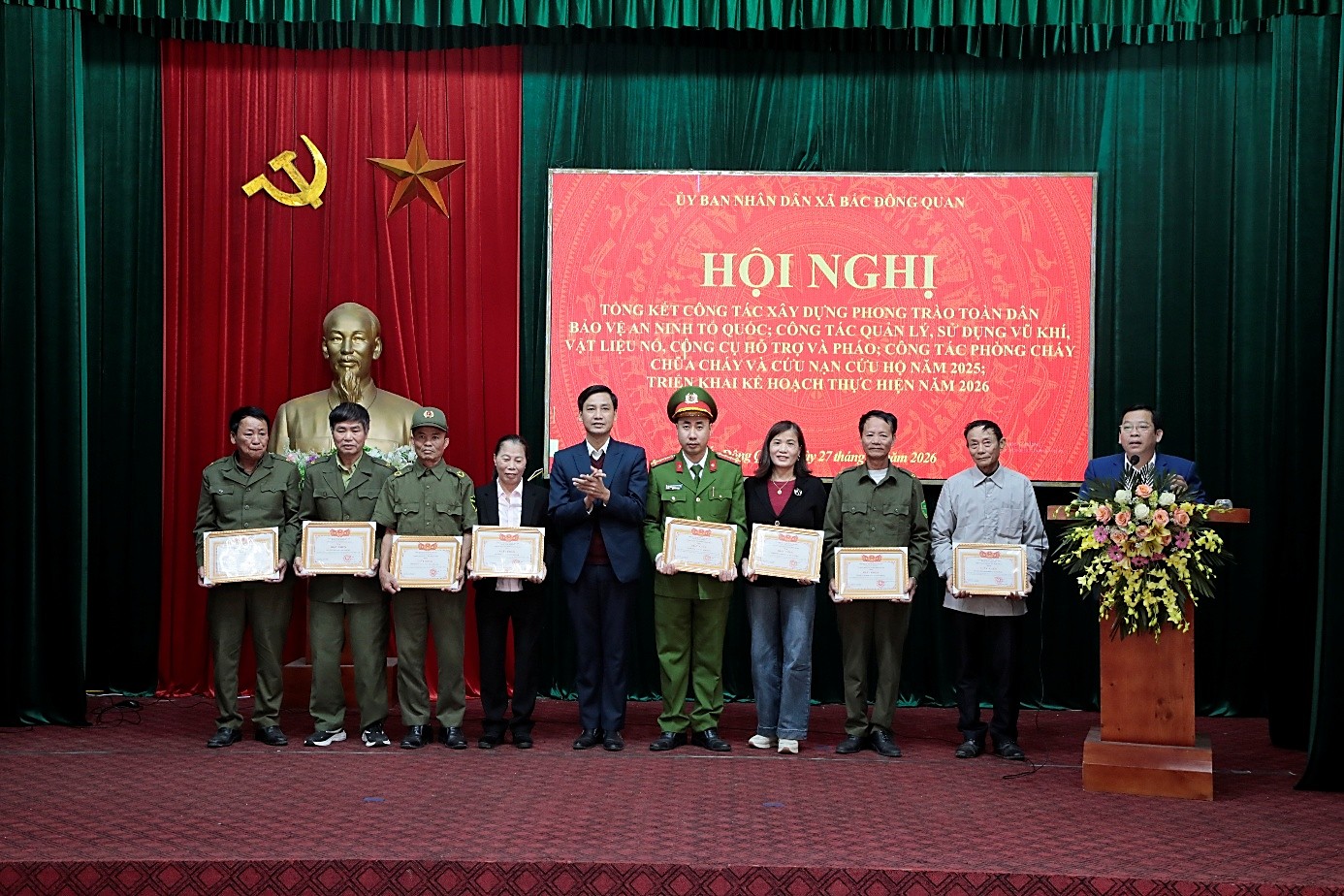 Nhân dịp này, 14 tập thể, 09 cá nhân đã được trao tặng Giấy khen của Chủ tịch UBND xã về thành tích xuất sắc trong triển khai phong trào toàn dân bảo vệ an ninh Tổ quốc; công tác tuyên truyền, vận động thu hồi, đấu tranh với các hành vi vi phạm pháp luật về quản lý, sử dụng vũ khí, vật liệu nổ, công cụ hỗ trợ và pháo; công tác phòng cháy, chữa cháy và cứu nạn, cứu hộ năm 2025.
