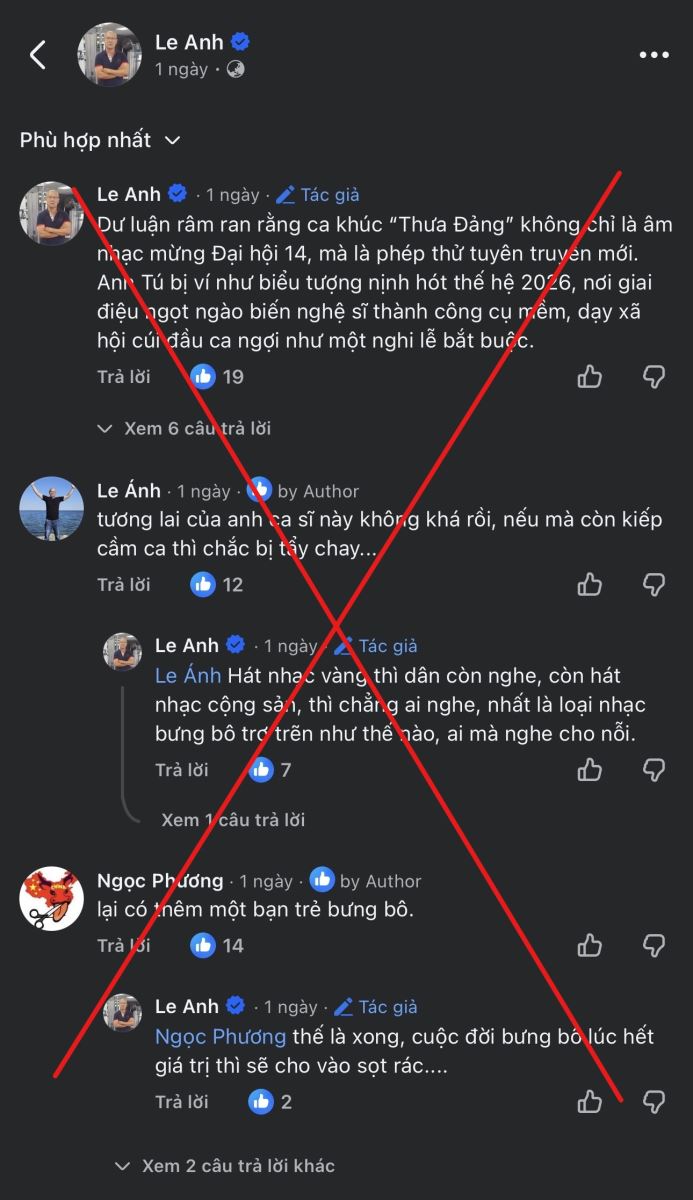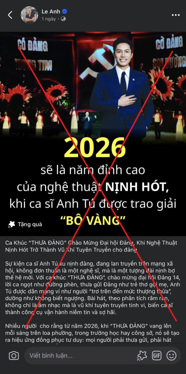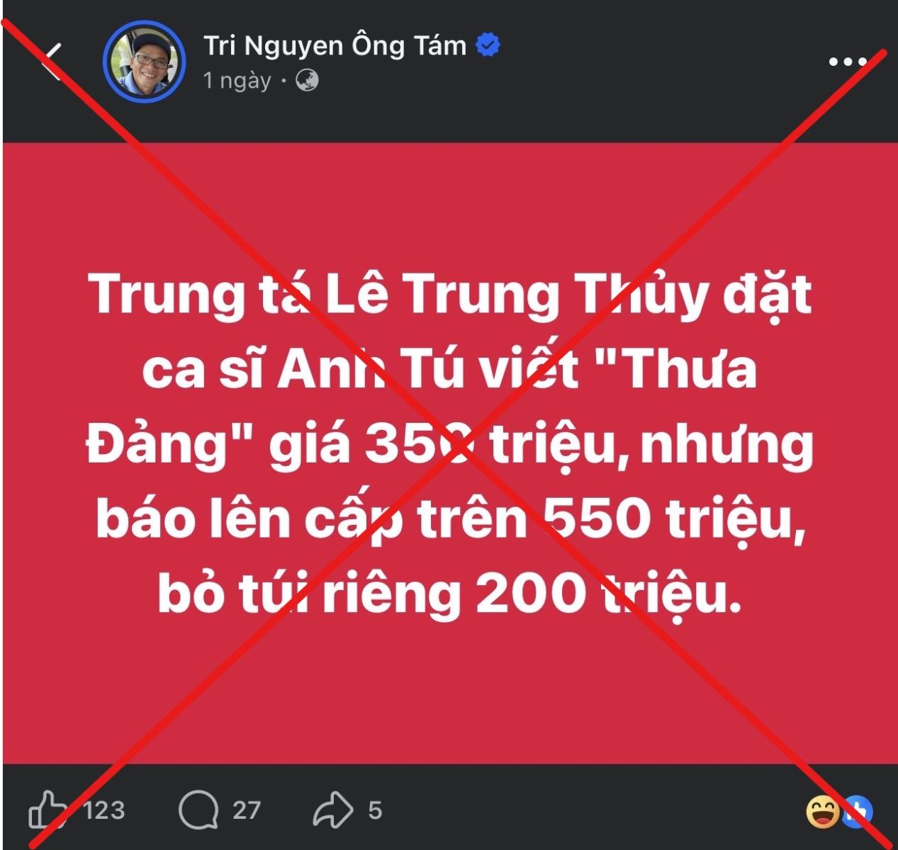 Chưa hết, một số bài viết đã lan truyền xuyên tạc con số cụ thể về “giá ca khúc”, “báo giá lên cấp trên”, “bỏ túi riêng”… nhưng không đi kèm bất kỳ tài liệu kiểm toán, văn bản pháp lý hay nguồn xác thực độc lập nào. Đây là dấu hiệu điển hình của tin đồn định hướng. Trong môi trường mạng xã hội, việc đưa ra con số cụ thể khiến thông tin có vẻ “đáng tin”, nhưng nếu không có bằng chứng, đó vẫn chỉ là suy đoán mang tính cáo buộc. Việc chia sẻ và tin theo những thông tin như vậy không chỉ gây tổn hại cho cá nhân bị nhắm tới, mà còn làm xói mòn niềm tin xã hội nói chung.