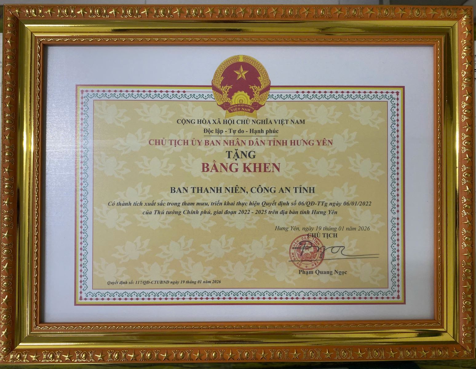 Vừa qua, Ban Thanh niên Công an tỉnh Hưng Yên vinh dự được Ủy ban nhân dân tỉnh Hưng Yên tặng Bằng khen vì đã có thành tích xuất sắc trong tham mưu triển khai thực hiện Quyết định số 06/QĐ-TTg ngày 06/01/2022 của Thủ tướng Chính phủ giai đoạn 2022 - 2025 trên địa bàn tỉnh.