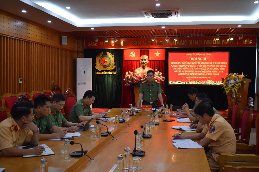 Ngày 22/4/2026, Ban Thường vụ Đảng uỷ Công an tỉnh đã tổ chức hội nghị triển khai quyết định cuộc giám sát việc lãnh đạo, chỉ đạo và tổ chức thực hiện Nghị quyết 57-NQ/TW ngày 22/12/2024 của Bộ Chính trị về đột phá phát triển khoa học, công nghệ, đổi mới sáng tạo và chuyển đổi số quốc gia; việc lãnh đạo, chỉ đạo và tổ chức học tập, quán triệt, triển khai Nghị quyết Đại hội đảng các cấp và Nghị quyết Đại hội đại biểu toàn quốc lần thứ XIV của Đảng đối với các Đảng ủy và đồng chí Bí thư, Phó Bí thư Đảng uỷ các Phòngthuộc công an tỉnh. Đồng chí Đại tá Nguyễn Thành Sơn, Phó Bí thư Đảng uỷ, Phó Giám đốc Công an tỉnh, Trưởng đoàn giám sát chủ trì hội nghị. Tham dự hội nghị có các đồng chí thành viên Đoàn giám sát; các đồng chí Bí thư, Phó bí thư đảng uỷ cơ sở được giám sát.