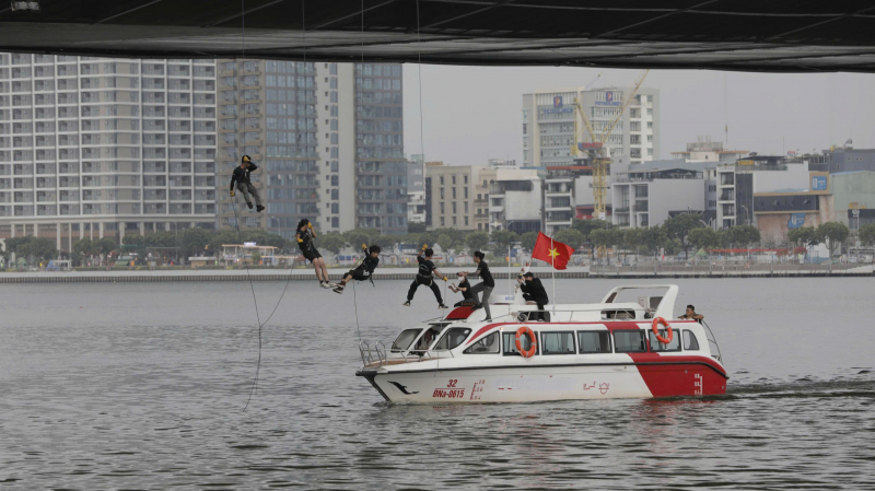 Các chiến sĩ Công an luyện tập các tình huống biểu diễn trên sông Hàn, sẵn sàng cho đêm Gala (Nguồn ảnh: báo Công an nhân dân online)