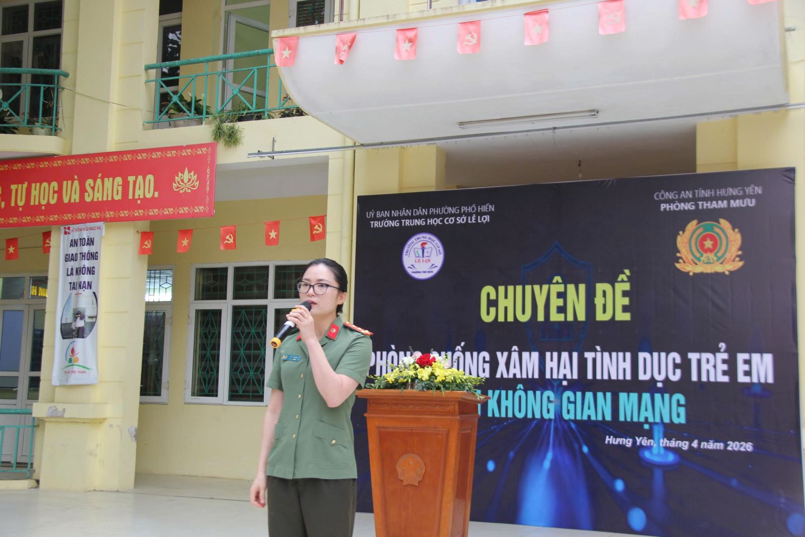 Nhân dịp kỷ niệm 80 năm Ngày Truyền thống lực lượng Tham mưu Công an nhân dân (18/4/1946 – 18/4/2026), Sáng ngày 13/4, Hội Phụ nữ - Đoàn Thanh niên Phòng Tham mưu Công an tỉnh đã phối hợp với Trường THCS Lê Lợi, phường Phố Hiến tổ chức hoạt động tuyên truyền chuyên đề “Phòng, chống xâm hại tình dục trẻ em trên không gian mạng” cho hơn 800 học sinh nhà trường.