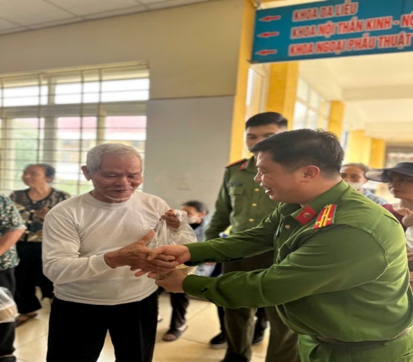 Hình ảnh đoàn viên và chỉ huy Công an phường tặng những suất cháo cho bệnh nhân và người nhà bệnh nhân tại bệnh viện Đa khoa tỉnh Hưng Yên