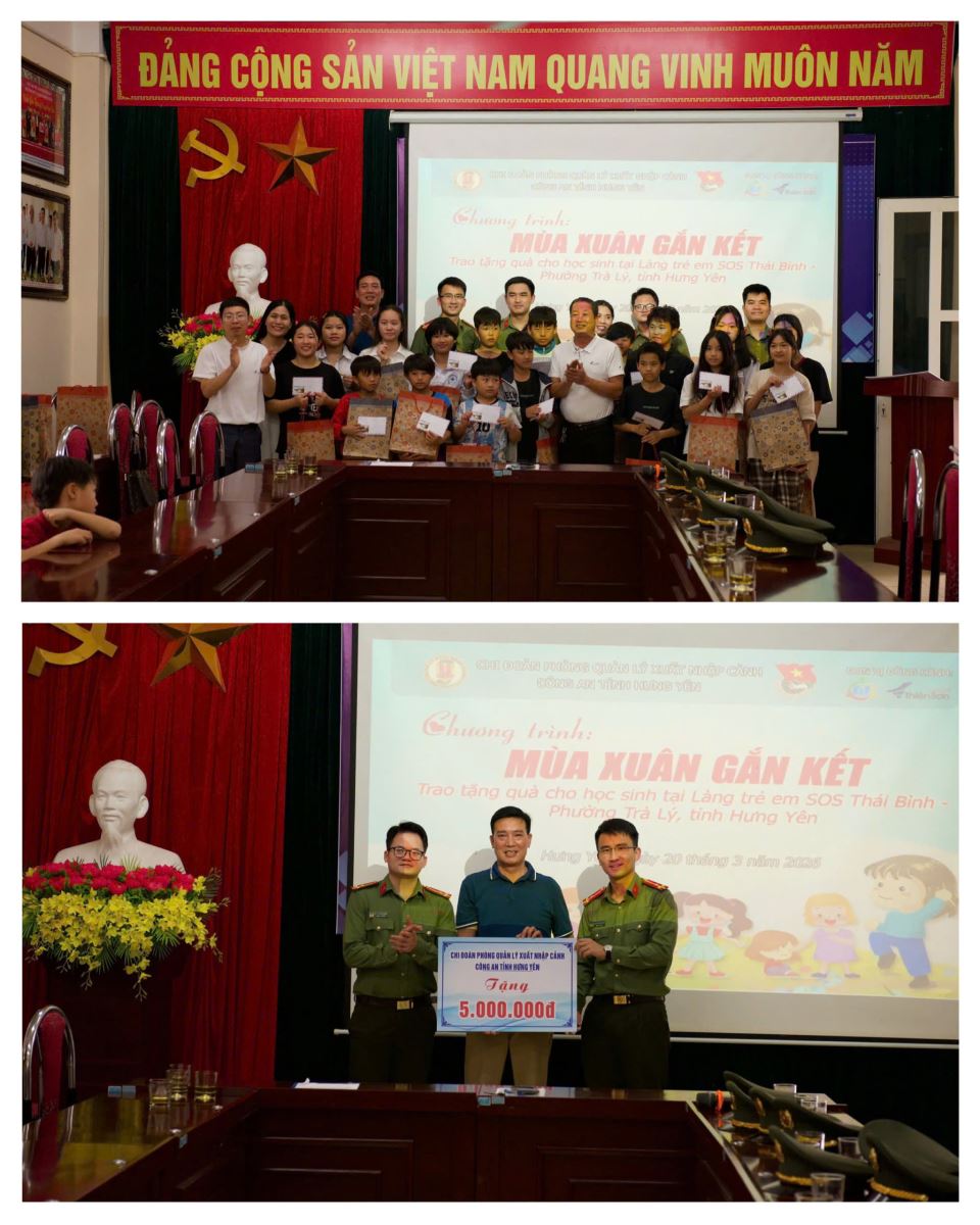 Chiều ngày 20/3/2026, Chi đoàn phòng Quản lý xuất nhập cảnh đã tổ chức chương trình “Mùa xuân gắn kết” tại Làng trẻ em SOS Thái Bình (phường Trà Lý, tỉnh Hưng Yên). Tại chương trình, chi đoàn đã tổ chức thăm hỏi, động viên và trao tặng 105 suất quà với tổng trị giá 35 triệu đồng cho các em nhỏ có hoàn cảnh khó khăn đang được nuôi dưỡng, học tập tại làng trẻ. Những phần quà thiết thực cùng sự quan tâm, chia sẻ của cán bộ, đoàn viên thanh niên đã góp phần mang đến niềm vui, sự ấm áp và động lực cho các em trong cuộc sống và học tập.