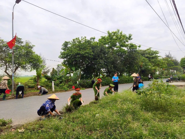 Hội viên phụ nữ Công an xã Hồng Vũ cùng với hội viên phụ nữ các chi hội thôn phát quang bụi rậm, dọn dẹp vệ sinh và trồng mới cây ven đường xây dựng “Tuyến đường hoa phụ nữ tự quản”